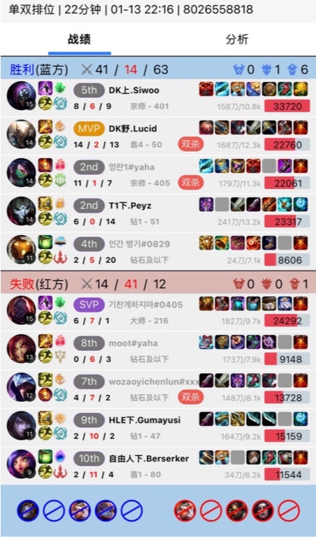 直播吧1月14日讯根据韩服排位统计小程序显示,Gumayusi(前T1冠军AD)和Berserker(前T1青训AD)韩服偶遇Peyz(T1新赛季AD),Peyz烬砍下6-0-14,Gumayusi厄斐琉斯被打成2-10-2,Berserker妮蔻战绩2-11-4。