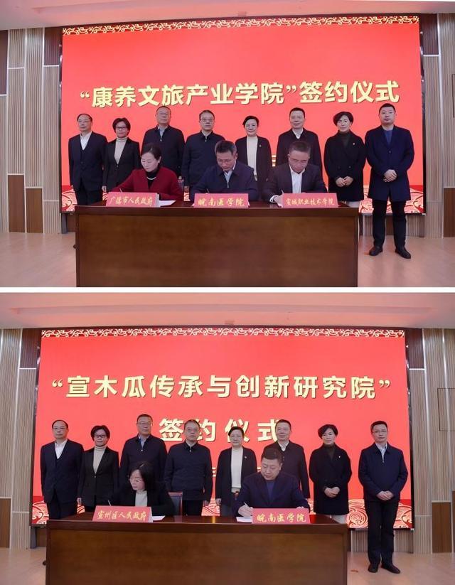 签约环节中,皖南医学院、宣城职业技术学院与广德市人民政府三方代表签署了共建“康养文旅产业学院”合作协议;皖南医学院与宣州区人民政府代表签署了共建“宣木瓜传承与创新研究院”合作协议。这些合作旨在面向“大黄山”建设与地方特色产业发展,深化产教融合与科研转化,共同培育区域发展新动能。