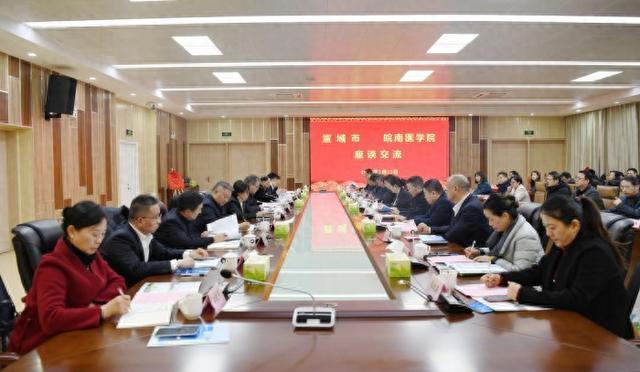 1月13日下午,皖南医学院与宣城市人民政府在滨江校区举行校地合作交流座谈会。宣城市委书记何淳宽,市委常委、组织部部长杨文武,市政府副市长杨林秀,宣城职业技术学院党委书记李斌,皖南医学院党委书记夏劲松,党委副书记、院长姚应水,党委副书记贾贤燕,党委常委、副院长韩永升、余结根出席会议。座谈会由夏劲松主持。