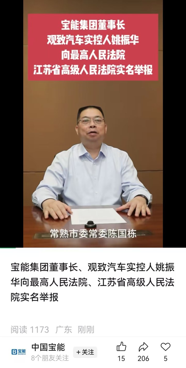 宝能集团董事长、观致汽车实控人姚振华今天通过宝能集团微信公众号,向最高人民法院和江苏省高级人民法院实名举报常熟市有关领导、常熟经开区管委会和常熟市人民法院在观致汽车2.7亿元执行案件中违法成立清算工作组、强制封控观致汽车工厂设备、超额查封执行、强制拍卖观致汽车的土地厂房及常规机器设备、专用车型设备等核心资产。
