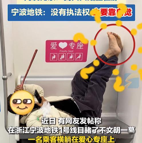 “太离谱了!”近日,浙江宁波,一名乘客上地铁后想找个位置坐,不想竟看到一男子赤脚横躺在爱心专座上,不仅一人占满整排专座,还把脚丫子直直抵在车厢墙壁上,这一幕被乘客拍下后发到网上引发热议。当地网友:我天天贴脸在那边墙上! 地铁爱心专座是为老弱病残孕等特殊群体设置的公共设施,旨在保障特殊乘客的出行便利,可宁波地铁里这名乘客的行为,却让爱心专座失去了原本的意义,还引发了其他乘客的强烈不适。 据媒体1月13日报道,一乘客在地铁上拍到有味道的一幕:一男子直接光脚横躺在爱心专座上,双腿高高抬起,脚丫子甚至直接抵在车厢的墙壁上,整个人占据了全部爱心专座区域,完全无视周围乘客的目光,也不顾及公共场合的礼仪和卫生。 拍摄者表示,看到这名乘客的举动后感到十分膈应,于是将画面拍摄下来发布到网上。视频一经曝光,立刻引发了网友的热议,大家纷纷指责这名乘客的行为既不文明,也浪费了爱心专座的公共资源。 对此相关部门回应已收到反馈,工作人员巡查时会劝阻躺卧,翘脚等行为,但是没有执法权,主要还需要乘客自觉。 网友看完纷纷表示,太没素质了,爱心专座不是私人躺椅。还有人吐槽,脚丫抵在墙上,后续乘客碰到得多膈应,也有网友呼吁,地铁方应加强管理,及时制止这类不文明行为。 信息来源:《乘客横躺地铁"爱心专座"还赤脚翘在车厢墙壁上引发热议 宁波地铁回应:没有执法权,主要靠自觉。》闪电新闻