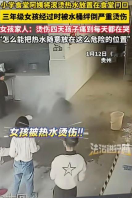 “严查到底。”贵州一小学食堂阿姨图省事,将两桶滚烫的开水放在食堂门口后,转身就去挪东西。谁能想到下一秒,一个三年级小女孩推门进来,一脚绊在桶上,导致整桶热水瞬间泼到她身上。食堂里只剩下白茫茫的水蒸气和孩子的哭喊,目前孩子已被送医治疗。  腊月的贵州还浸在湿冷里,某小学食堂的棉帘栊沉甸甸地垂着,把后厨的热气和门外的寒风隔成两个世界。 上午十点多,食堂里飘着残留的饭菜香,工作人员正忙着收拾早餐后的残局,清洗堆积的碗筷。 食堂阿姨李姐(化名)刚把两桶水烧开,白花花的水蒸气顺着桶口往上冒,带着灼人的温度,烫手的桶壁让她不得不垫着抹布才敢触碰。 原本她应该一桶一桶的提走,但为了省事,李姐直接提了两桶热水快步走到食堂门口,随后将这两桶滚烫的热水放下,抬手正准备将门口的帘栊掀开时,意外发生了。 当时临近上课,三年级的老师见班里还有那么多学生没回来,便让小悦(化名)去食堂,喊那些还在食堂的同学赶紧回教室。 小悦收到任务以后,一路小跑向食堂冲去,没曾想速度太快一进门就被门口的热水桶绊倒了,只听 “哗啦” 一声巨响,整桶滚烫的开水瞬间失去平衡,朝着小悦的方向泼了下来。 李姐一见冲出来一个女孩,第一时间将孩子拉出热水滩中,但还是为时已晚,大片大片的热水洒到了小悦的身上,热水顺着她的校服外套往下淌,浸透了内衣,烫得她立刻尖叫起来。 附近收拾餐具的工作人员听到声音,赶紧冲了过来,只见小悦的校服已经和皮肤粘在了一起,领口、袖口和裤腿的布料都被烫得变了形,裸露在外的手腕和脚踝处,皮肤已经红得发紫,还起了密密麻麻的小水疱。 李姐吓得脸色惨白,手里的抹布都掉在了地上,她赶紧和同事一起冲过去,小心翼翼地帮小悦脱掉外套,又用食堂里干净的冷水轻轻冲洗她的烫伤部位。 负责引导的老师也跑了过来,一边安抚大哭的小悦,一边赶紧掏出手机拨打 120,同时联系了小悦的家长。 小悦的妈妈接到电话时正在上班,听到孩子被开水烫伤,吓得手都抖了,一路哭着往医院赶。 救护车呼啸着赶到学校时,小悦的哭声已经嘶哑,脸上满是泪水和汗水,嘴唇因为疼痛和害怕变得发白。 医生初步检查后,立刻对她的烫伤部位进行了紧急处理,用无菌纱布轻轻包扎好,然后迅速送往医院的烧伤科。 经过详细检查,小悦的前胸、手臂和大腿多处被二度烫伤,部分区域的水疱已经破裂,需要立即进行清创和抗感染治疗。 接下来的四天,对小悦和她的家人来说格外漫长。医院的病房里,消毒水的味道混合着烫伤膏的气味,小悦躺在床上,身上裹着厚厚的纱布,稍微一动就会牵扯到伤口,疼得她立刻哭起来。 每天换药的时候,医生要小心翼翼地清理创面,去掉坏死的组织,小悦疼得浑身发抖,紧紧攥着妈妈的手,指甲都嵌进了妈妈的肉里,眼泪像断了线的珠子一样往下掉,嘴里不停地喊着 “妈妈,我好痛,我再也不要去食堂了”。 小悦的妈妈坐在病床边,眼睛红肿得像核桃,四天来几乎没合过眼。她看着孩子痛苦的样子,心里像刀割一样难受。 “这四天,孩子就没睡过一个安稳觉,刚要睡着,稍微一动牵扯到伤口,就会哭醒。有时候痛得实在受不了,就抱着我一直喊,怎么能把那么烫的水放在那种地方?” 她轻轻抚摸着小悦的额头,声音里满是心疼,“食堂门口是孩子每天都要走的路,帘栊后面根本看不见,而且那水桶也没个防护,万一再有人碰到怎么办?” 此事件被报道到网上后,也引起了网友们的讨论,有的网友认为是李姐的错,表示”门口肯定有人进岀的热水真不应该放门口,而且有门帘孩子正常走进来怎么会想到有热水桶放在门口呢” 但还有网友认为是孩子的错,在评论区表示“感觉整个事情,就是孩子动作太快,视频不太连续,猜测,大概是阿姨提水到门口,发现帘子挡视线,当下水桶,将帘子撩起来卡住,结果孩子就跑进来了。” 但这样的说法立刻就被其他网友反驳了,表示“真不知道楼下说得同情阿姨的人怎么想的?还有人点赞? 那么小的孩子谁同情?你烫一个试试,棉衣裹着,加重烫伤程度,你都不一定能忍受这种疼痛” 目前,调查还在进一步进行中,相关部门表示会 “严查到底”,根据调查结果依法依规追究相关人员的责任,同时督促学校全面整改,消除安全隐患。 这样类似的事儿真不是头一回发生,去年有一所小学,就因为食堂工作人员把热汤搁在走廊,导致一个一年级的小朋友撞翻汤碗,胳膊被烫伤,那孩子光恢复就用了一个月,学校还被全市通报批评。  校园安全无小事,任何一个不起眼的疏忽,都可能给孩子带来一辈子的伤害,学校应该重视食堂的细节安全,开展安全排查,希望能让每个孩子在校园里都能安全快乐地成长。 对于这件事,您有什么想说的吗?欢迎评论区留言讨论。 信源:法治进行时2026-01-13——《小学食堂阿姨将滚烫热水放置在食堂门口三年级女孩经过时被水桶绊倒严重烫伤……》