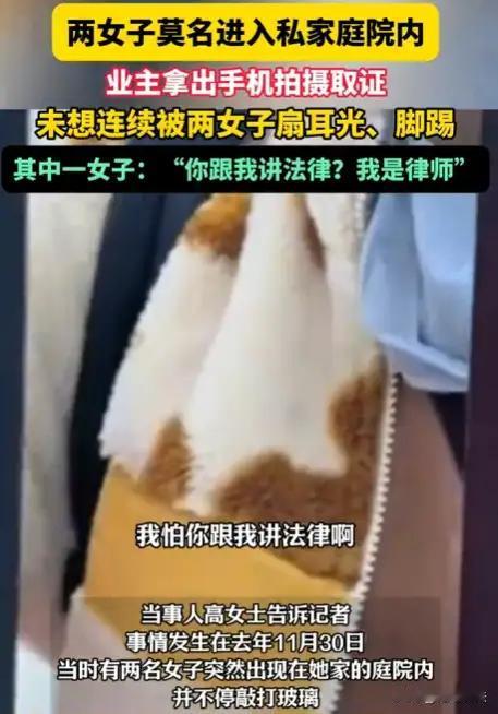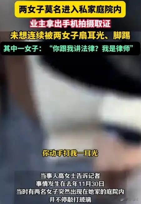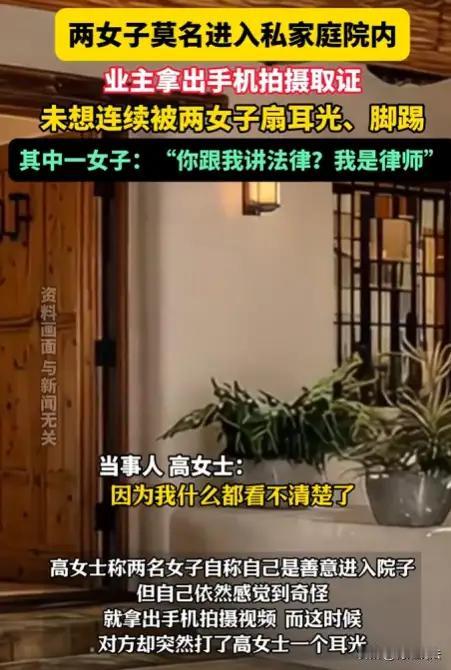 **她们闯进别人家院子拍照打卡,被打还理直气壮:我是律师,不怕法律!** 云南大理,本是风花雪月的浪漫之地。 可一场“网红式出游”,却让私人住宅成了被践踏的景区。 两名女子旅游途中,见一独栋小院绿植环绕、白墙黛瓦,极具“ins风”,便毫不犹豫翻门而入,踩着草坪摆拍自拍。 屋主高女士听到异响出门查看,当场愣住:“这是我家!你们怎么随便进来?” 她没有大吵大闹,而是冷静拿起手机录像取证—— 下一秒,画风突变: 其中一名女子冲上来抢手机、扇耳光,另一人脚踹腹部,两人围殴高女士长达三分钟。 而最令人寒心的一幕是—— 当高女士喊出“这是违法入侵!”时,对方冷笑回应: **“我就是律师,我不怕讲法律!”** 一句“我是律师”,不是用来维护正义,而是成了**施暴的护身符**。 这哪是懂法?这是在**利用公众对法律的信任,行霸凌之实!** 更让人愤怒的是后续: 高女士报警,警方出具行政立案通知书,明确“涉嫌殴打他人”。 可一个多月过去,**无人被拘、无人道歉、案件石沉大海**。 她每天打开手机,看到的不是进展通报,而是那条被疯传的视频里自己狼狈倒地的画面。 我们不禁要问: 擅自闯入民宅不违法吗? 暴力伤人取证者不该追责吗? 一句“我是律师”,就能让执法慢半拍? 这件事早已不是一起普通纠纷, 它撕开了一个危险口子: 有人正用身份包装恶意,用“特权感”挑战公序良俗。 值得庆幸的是,越来越多网友站出来支持高女士: **房子再美,也不是景点;你再美,也不能无法无天!** 你的家不是景区 别让“我是谁”凌驾于“法律是什么” 每一个拒绝沉默的人,都值得被守护网络舆论自由 版权边界