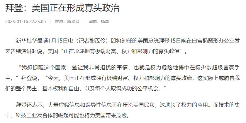 佩洛西将是美国甚至全世界的罪人! 2024年美国大选前夕,一场针对拜登的退选风波愈演愈烈。起初只是私下流传的议论,很快就演变成公开的呼吁,而这一切的背后,拜登直指佩洛西是民主党内推动他退选的主要煽动者。   佩洛西虽未公开喊话让拜登下台,却总在关键时刻煽风点火,每当党内逼退声浪稍有平息,她就会暗中推动,重新给拜登施压。她还利用与拜登的私人关系,私下警告他可能输掉大选,甚至会拖累民主党失去参众两院的控制权。   最终,拜登不得不发布亲笔信,宣布退出总统竞选,称这是“为了党和国家的最大利益”。可讽刺的是,佩洛西后来还抱怨拜登退选太晚,导致民主党来不及重新举行初选,这种前后矛盾的做法,尽显其两面三刀的本性。   这场逼宫闹剧,看似是民主党内的权力博弈,实则让美国错失了可能的稳定局面。外界对拜登的评价向来褒贬不一,有人调侃他执政期间频繁使用签字笔签署法案,有人吐槽他公开场合多次摔倒的狼狈,还有人笃定他即便参选也无法在2024年大选中取胜。   但抛开这些争议,拜登却是个极具远见的人。2025年1月,拜登在白宫椭圆形办公室发表告别演说,其中的诸多担忧,如今都一一变成了现实。   拜登当时警告,美国正在形成一个由少数超级富豪掌控的寡头政治,权力集中在极少数人手中,这对国家的公平与权利是巨大威胁。他还提到,科技工业复合体的崛起暗藏危险,美国人正被大量虚假信息淹没,而社交媒体放弃事实核查的行为,会让谎言与权力、利益捆绑,肆意蔓延。   如今的美国,正深陷拜登当初预警的困境。社交媒体巨头Meta公司已宣布,终止推行了8年的第三方事实核查机制,旗下的Facebook、Instagram等平台不再由专业机构核实信息真实性,转而采用用户撰写的社区笔记模式。   这一决定直接让虚假信息失去了重要约束,谎言裹着权力与利益四处扩散,即便是美国国内的新闻,也难寻真实踪影。   更让人忧心的是,美国的自由媒体正日渐衰败,过去十年间,报社编辑部的员工人数下滑幅度超过45%,大量编辑岗位被缩减,原本该坚守真相的新闻从业者越来越少。   没有了专业的事实核查,没有了足够的编辑力量挖掘真相,舆论场里的真假边界越来越模糊,人们很难再分辨信息的真伪,社会分歧也随之不断加剧。   佩洛西的一己之私,用一场逼宫大戏逼迫拜登退选,让美国失去了可能延续的稳定政策方向。而她或许从未想过,自己的政治操作,会让拜登早已预警的危机彻底爆发。   如今的美国,虚假信息泛滥,媒体公信力崩塌,社会撕裂加剧,这些乱象不仅让美国民众深受其害,也给世界带来了诸多不确定因素。