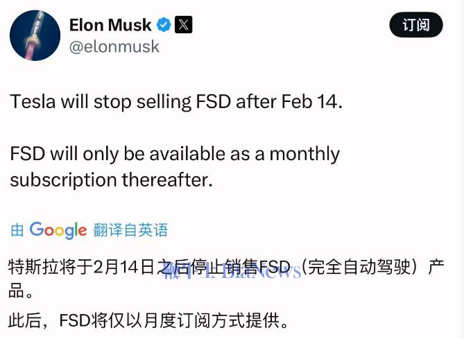 马斯克:特斯拉将在2月14日后停止销售FSD,此后仅能月度订阅