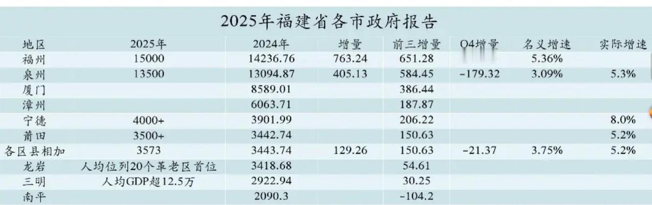 福建5市2025年GDP预计数值出炉:福州泉州差距扩大、宁德破四千亿 福建是我国经济十强省份之一,截止目前,福建已有5个城市2025年官方预计数值更新出炉了,其中福州和泉州位居全省前二名,官方预计数值分别为1.5万亿和1.35万亿,较2024年保底增加了763.24亿和405.13亿,泉州自从经济总量被福州反超后,与福州的差距逐年在扩大。 厦门2025年GDP官方数据暂未更新出炉,但是突破九千亿是不在话下,宁德2025年GDP总量也是突破四千亿大关,至于超过多少,目前暂且犹未可知。 莆田2025年GDP总量突破3500亿,较2024年增加了150.63亿,根据各区县预计数值相加,2025年莆田GDP数值比官方预计数值还高73亿。