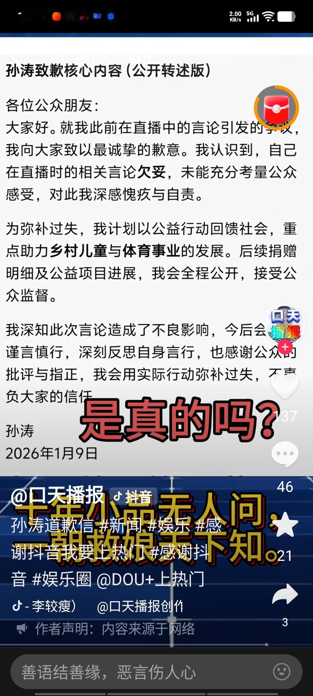 在闫学晶书面道歉后,曾力挺她的孙涛也发文致歉。具体内容为:“我对在直播间的不当言论所引发的争议,向大家致以最诚挚的歉意。我已认识到所说言论欠妥,未能考量公众感受,深感愧疚与自责。为弥补过失,我愿意通过公益行动回馈社会,助力乡村儿童和体育事业的发展。今后我会注意自身影响,谨言慎行,接受大家的监督,用实际行动弥补过失。” 孙涛是一位招人喜爱的小品演员,与闫学晶交往密切、关系甚好。闫学晶事发后,有人在孙涛直播间询问相关情况,他在未了解事情真相时便信口开河,为朋友两肋插刀,结果引火烧身。这实在是欠考虑的行为,他没意识到事情的严重性,反应还不如80岁的何庆魁快,真是糊涂! 这次致歉,他或许是怕影响自己的春晚演出,明显是在玩软拖战术。不管是真是假,期待孙涛能知错就改。请大家监督他的公益行动,看他能否挽回影响,咱们就拭目以待吧!