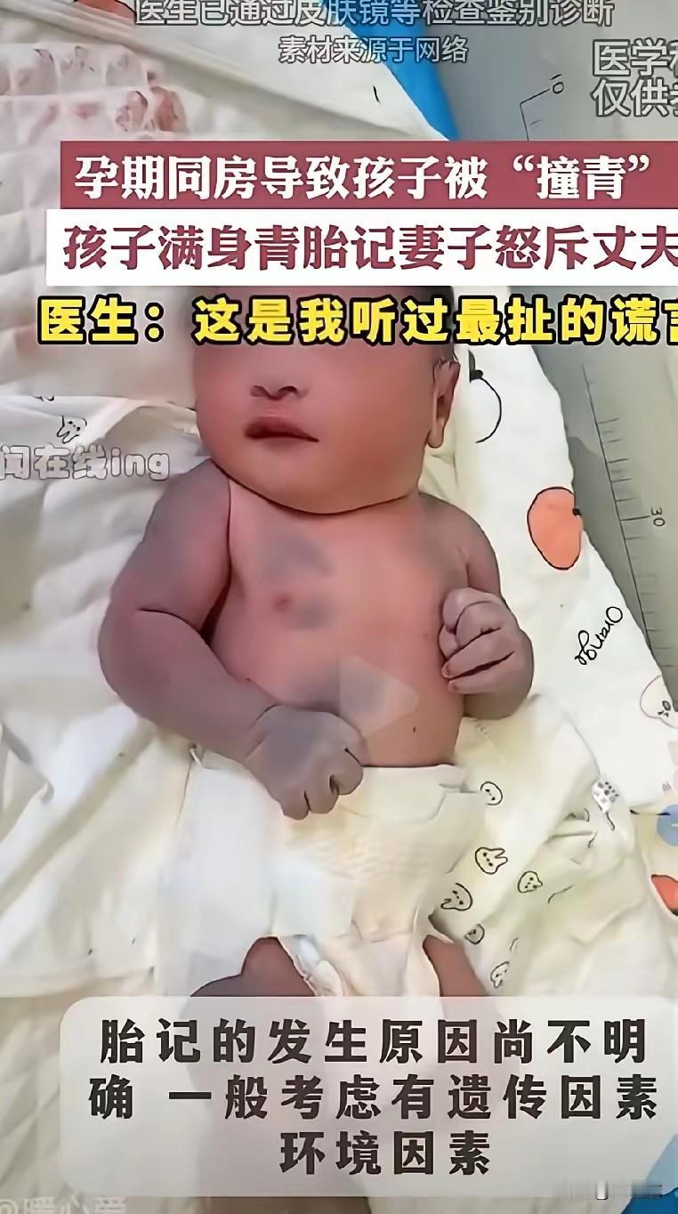 新生儿满身青胎记妻子怒斥丈夫,都是孕期同房导致孩子被撞青的,医生说这是他听过最扯淡的谎言。 看到妻子给医生说是孕期同房被老公给撞青的,差点没把我给笑死,你说个其它理由也许还能糊弄过去,但你说出这么荒唐的理由来,就连医生都不相信,更别说让孩子爹背这个锅了,这不是睁着眼睛说瞎话吗?我活了几十年了第一次听到胎记是同房被撞青的,这话说出去会有人信吗? 胎记这不是在新生儿身上很常见吗,胎记要么就是基因遗传引起的,要么就是怀孕时基因突变引起的,目前对胎记的发生原因也没有固定的说法,但你说胎记是孕期同房被撞青的,这话会有人信吗?