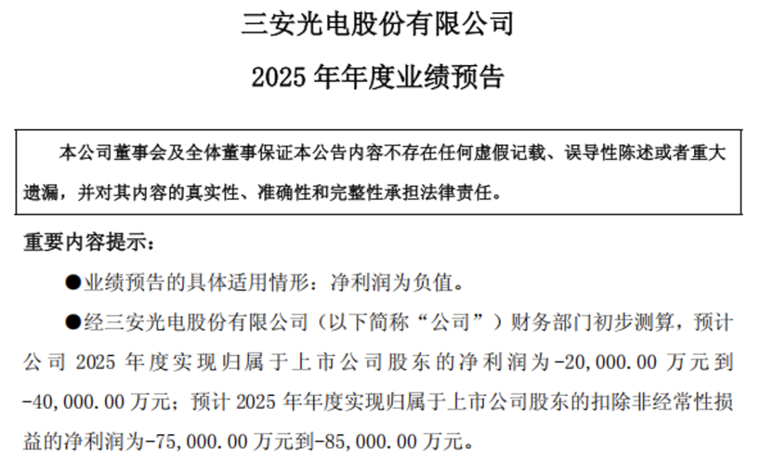 1月12日晚间,三安光电(600703.SH)公告称,预计2025年度归母净利润同比转亏,亏损额约在2亿元到4亿元之间;预计扣非后归母净利润亏损7.5亿元到8.5亿元。这或是公司自2008年借壳上市以来,归母净利润首次亏损。