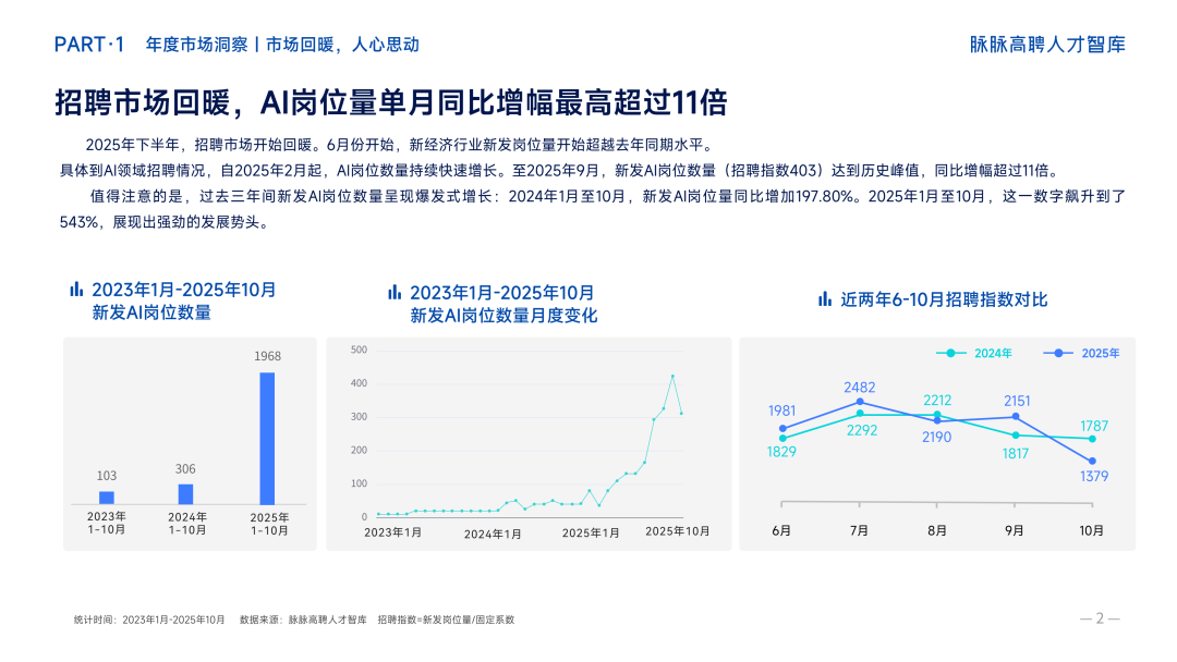 AI领域的表现尤为亮眼。2025年9月,新发AI岗位数量达到历史峰值,单月同比增幅超过11倍;2025年1月至10月,新发AI岗位量同比增长543%。