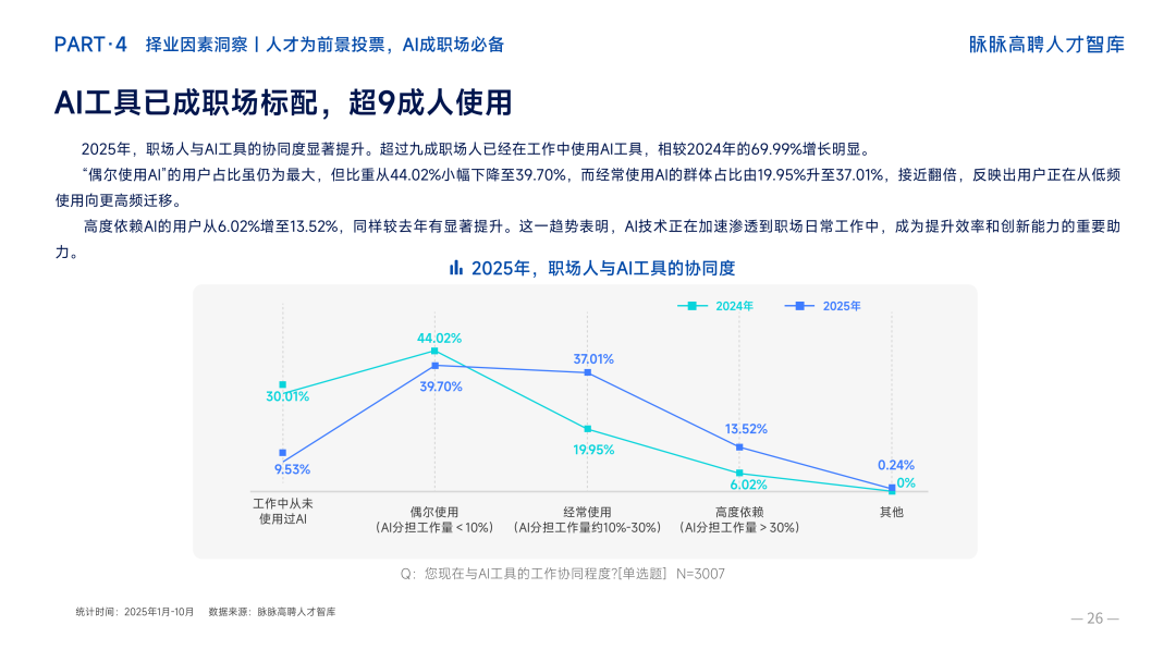 脉脉高聘人才报告显示,职场人使用AI工具的比例从2024年的69.99%,飙升至2025年的超过90%。「从未使用」AI工具的比例从30.01%暴跌至9.53%,而「经常使用」AI工具的比例从19.95%跃升至37.01%,几乎翻了一倍。「高度依赖AI」的用户从6.02%增至13.52%。