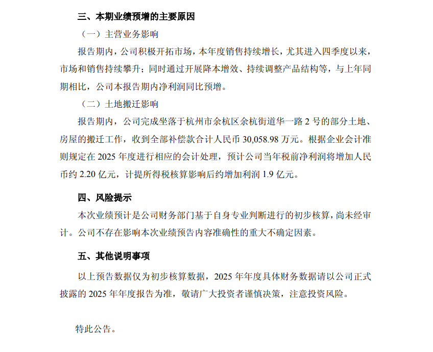 本期业绩预增的主要原因包括主营业务影响和土地搬迁影响。报告期内,公司积极开拓市场,本年度销售持续增长,尤其进入四季度以来,市场和销售持续攀升;同时通过开展降本增效、持续调整产品结构等,与上年同期相比,公司本报告期内净利润同比预增。此外,报告期内,公司完成坐落于杭州市余杭区余杭街道华一路2号的部分土地、房屋的搬迁工作,收到全部补偿款合计人民币30,058.98万元。根据企业会计准则规定在2025年度进行相应的会计处理,预计公司当年税前净利润将增加人民币约2.20亿元,计提所得税核算影响后约增加利润1.9亿元。