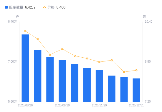 日期A股户数(户)流通A股户均持股数(股)户均持股市值(万元)2025-12-31641519640.968.162025-12-19646439567.588.032025-12-10651249496.928.412025-11-20671839205.868.092025-11-10678189119.668.142025-09-30691848939.608.082025-09-19705338768.628.162025-09-10715508643.997.852025-08-31740168355.998.112025-08-20795607773.727.80