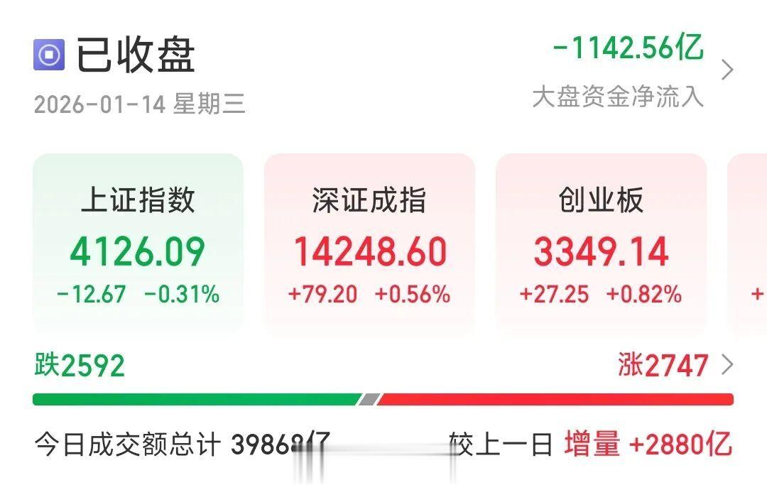 中国商报(记者马文博)1月14日,A股成交额再创新高,来看具体情况:截至收盘,上证指数跌0.31%报4126.09点,深证成指涨0.56%报14248.60点,创业板指涨0.82%报3349.14点,北证50涨0.98%报1580.87点。全市场成交39868亿元,较上一日放量2880亿元,再创历史新高。