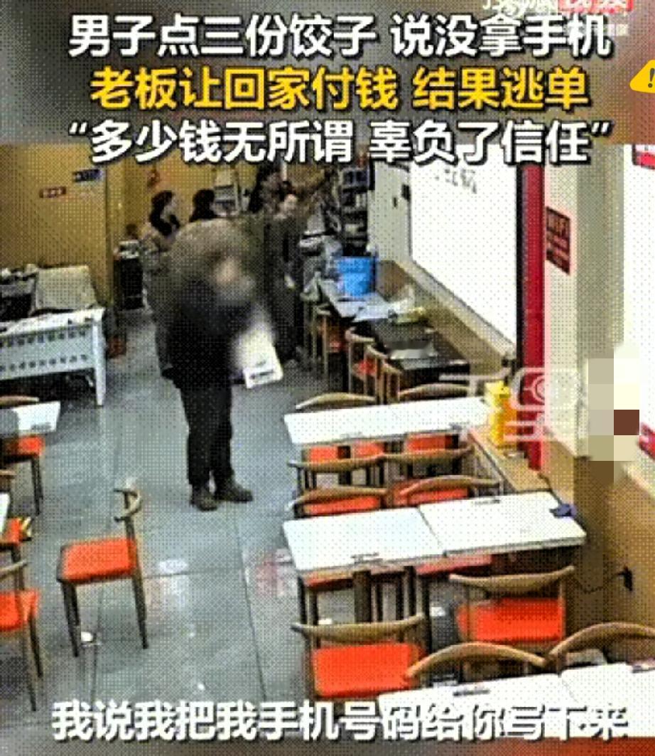 62块钱就能买断一个人的诚信? 黑龙江佳木斯这事儿真让人心里发堵。 男子点三份生饺子说要给老婆孩子吃,转头就拿家人当幌子,装模作样找手机骗老板信任,说晚点转钱,结果直接失联。 老板不是傻,是愿意相信人间有善意,觉得这点钱没人会当回事,可偏偏有人把别人的善良当可乘之机。 这哪是逃单,分明是在消耗整个社会的信任存量。 老板寒心的不是丢了62块,是以后再有人真忘带手机求助,他可能不敢再点头。 失信从来都不是小事,你省的是小钱,毁的是别人的善意,堵的是后来者的路。 信用这东西,攒起来难如登天,塌下去只要一瞬间。 你觉得这种拿家人博同情的失信行为,该怎么约束才管用?