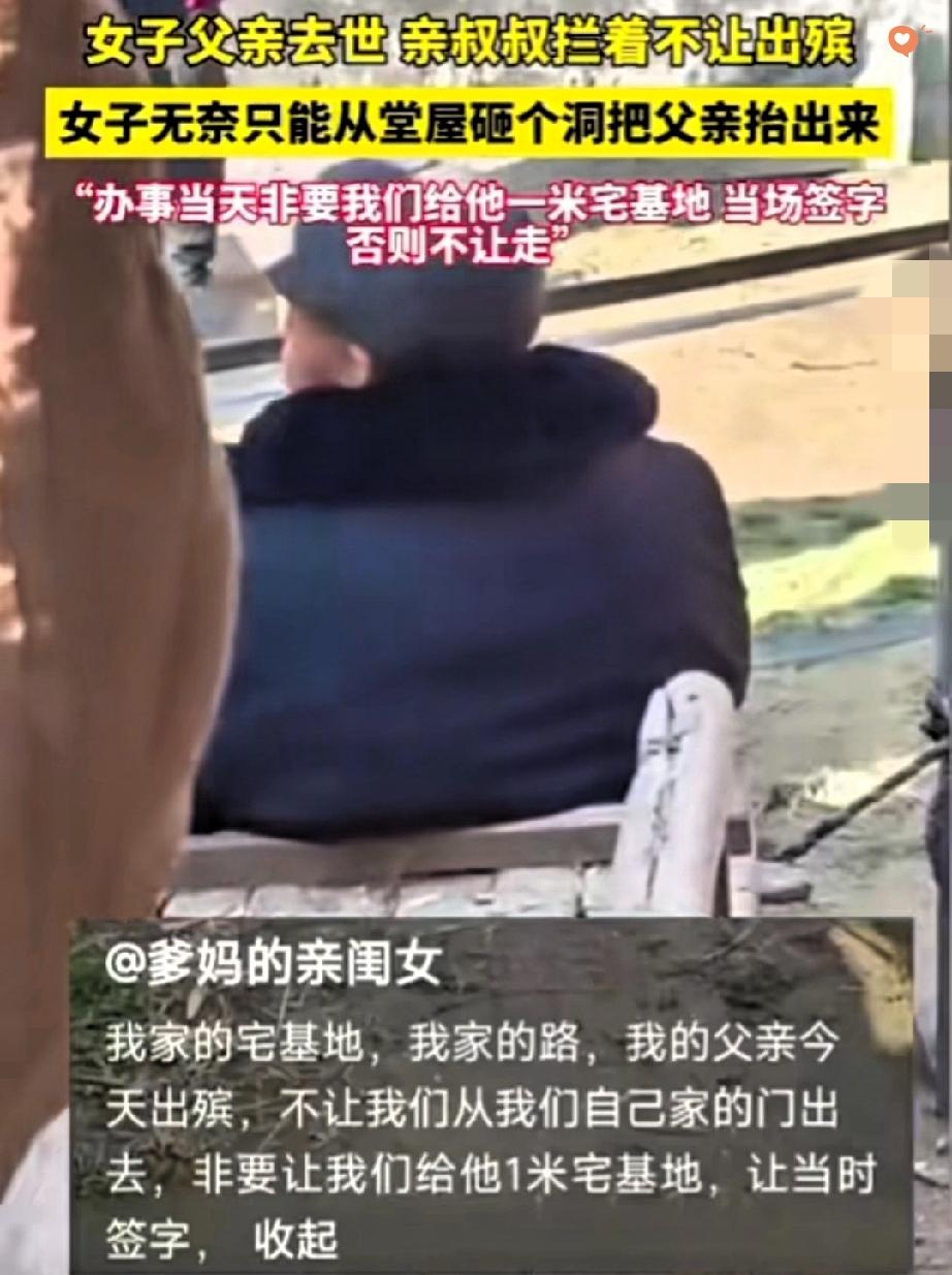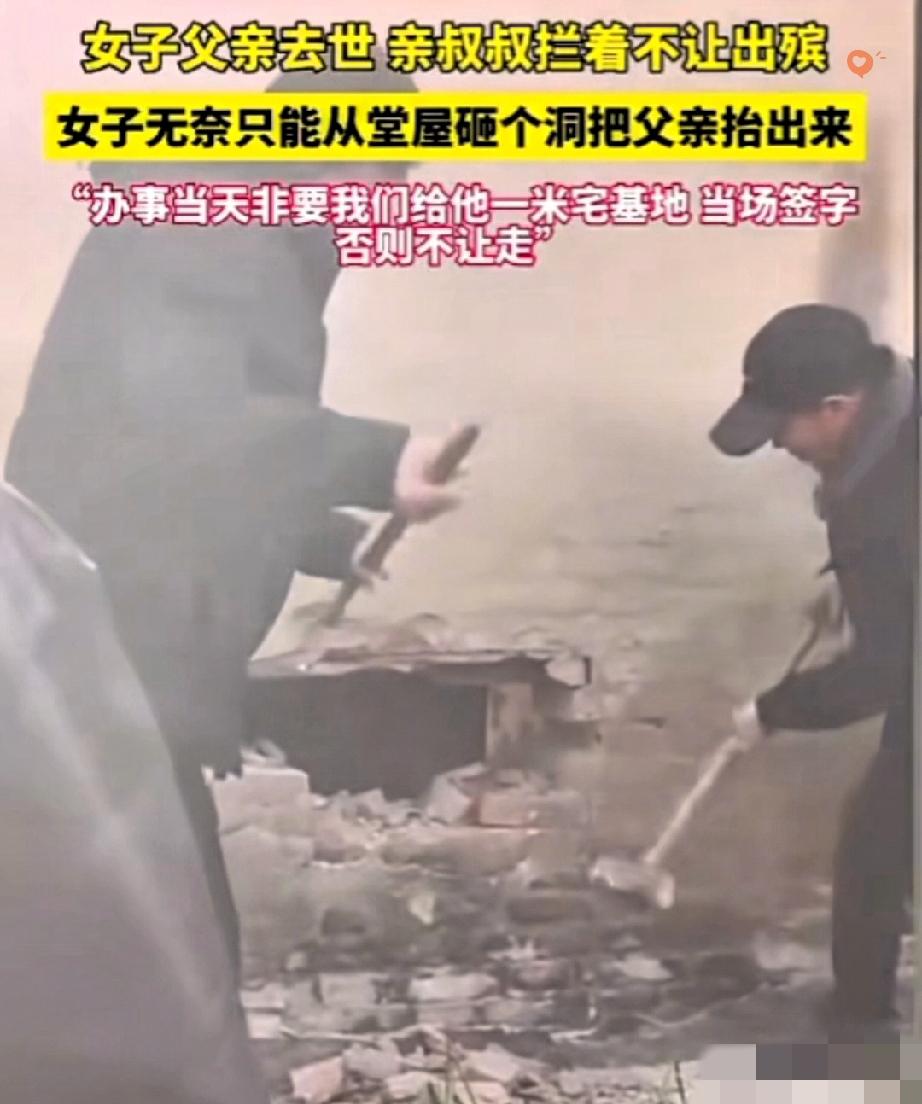 亲哥尸骨未寒,亲弟弟就拿1米宅基地堵着出殡的路,这哪是亲人,分明是披着亲情外衣的豺狼! 女子父亲刚去世,悲痛还没缓过来,就被亲叔叔逼着让地,不然就不让从门前过。 无奈之下,她只能在堂屋打洞,背着父亲的遗体出门,这一幕看得人又气又心疼。 叔叔的算盘打得叮当响,觉得侄女嫁了人,家里的东西就该归他。 可他忘了,血脉亲情不是抢占地盘的筹码,逝者为大不是一句空话。 更让人揪心的是,这事又被扯到“没儿子”的话题上,可问题的根源从来不是性别,是某些人骨子里的贪婪和冷血。 亲情在利益面前碎成渣,真的太讽刺了。你身边有过这种为了一点利益就撕破脸的亲戚吗?