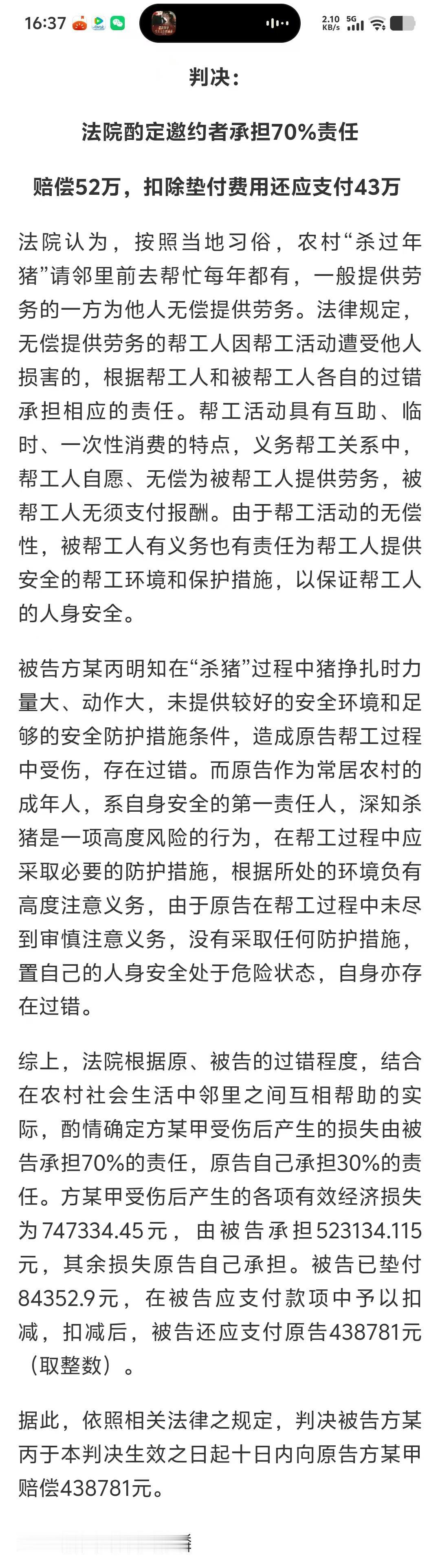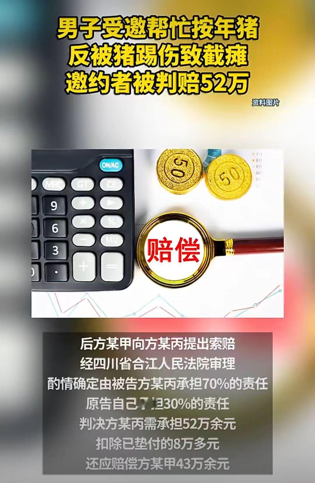 四川合江一位66岁的大爷,邻居家过年要杀猪,就请大爷过去帮忙按猪。 结果猪挣扎的太厉害,把大爷踢倒在地,直接摔成了四肢瘫痪、四级伤残。 这下麻烦了,哪知道好心帮忙,结果却摔成瘫痪了呢? 现在生活自理都成问题了,后期康复也是要钱。 大爷把邻居起诉了,法院酌定邀约者承担70%责任赔偿52万,扣除垫付费用还应支付43万。 乡里乡亲有时碍于情面不好拒绝,但是情面不能替代自身安全。 杀猪本就是图个喜庆、吉利,但是如果喜庆变成悲剧,就得不偿失了。 农民杀猪 四川杀猪 农村杀猪纠纷 杀猪宴