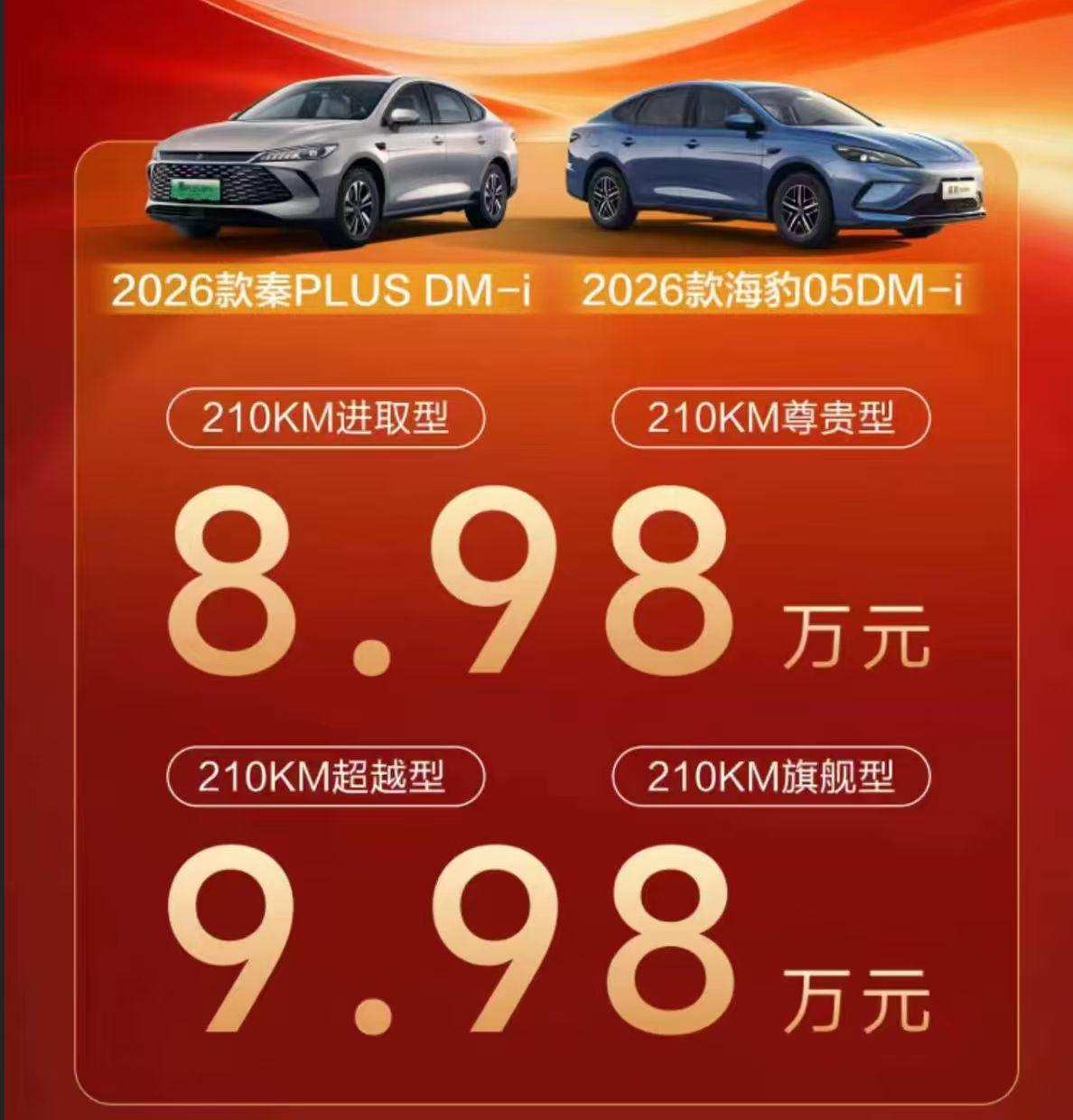这让其他车企还怎么玩?两大销冠继续加码堆料,丢出4个2的王炸还带3个C! 最近乘联会公布了2025年的销量榜单, 比亚迪秦家族两兄弟分别拿下各自市场的销量冠军,其中秦L以26.4671万辆的成绩拿下中级轿车年度销冠,而秦PLUS以38.7315万辆拿下A级(紧凑型)轿车销冠,注意,这已经是秦PLUS连续第三年霸榜A级轿车市场了。 但比亚迪并没有满足这两个销冠,2026年一开年就直接上新加推,8万多的秦PLUS DM-i直接干到210KM的纯电续航,要知道今年可不比前两年(电池原材料成本下降),最近电池原材料价格一直在涨。 既然插混要实现210KM的纯电续航,那就必须把电池加大到25.28kWh,再结合第五代DM插混技术,油耗在2.79L,这样一来综合续航就达到2110KM,这就是前面说到的4个2。至于这3个C,分别是辅助驾驶——天神之眼C、云辇C(预瞄系统)、TBC(高速爆胎稳定系统)。 要知道这可是十万元价位段的车型,不仅把纯电续航提升到了210KM,甚至还上了云辇C,秦L的高配版本还配置了冷暖冰箱、HUD等,这些不应该是小20万元的车才给配置吗?现在直接下放到10万+了。 一点不夸张的说,比亚迪这张牌一打出来好多车企都不知道怎么接了,插混大电池确实是大趋势,但是比亚迪秦系列直接加到210KM确实有点猛,再结合其他的升级,插混电力再加码,升级非常大,技术下放也挺快,考虑到这还是销冠车型,比亚迪这样玩,其他车企还怎么接招?
