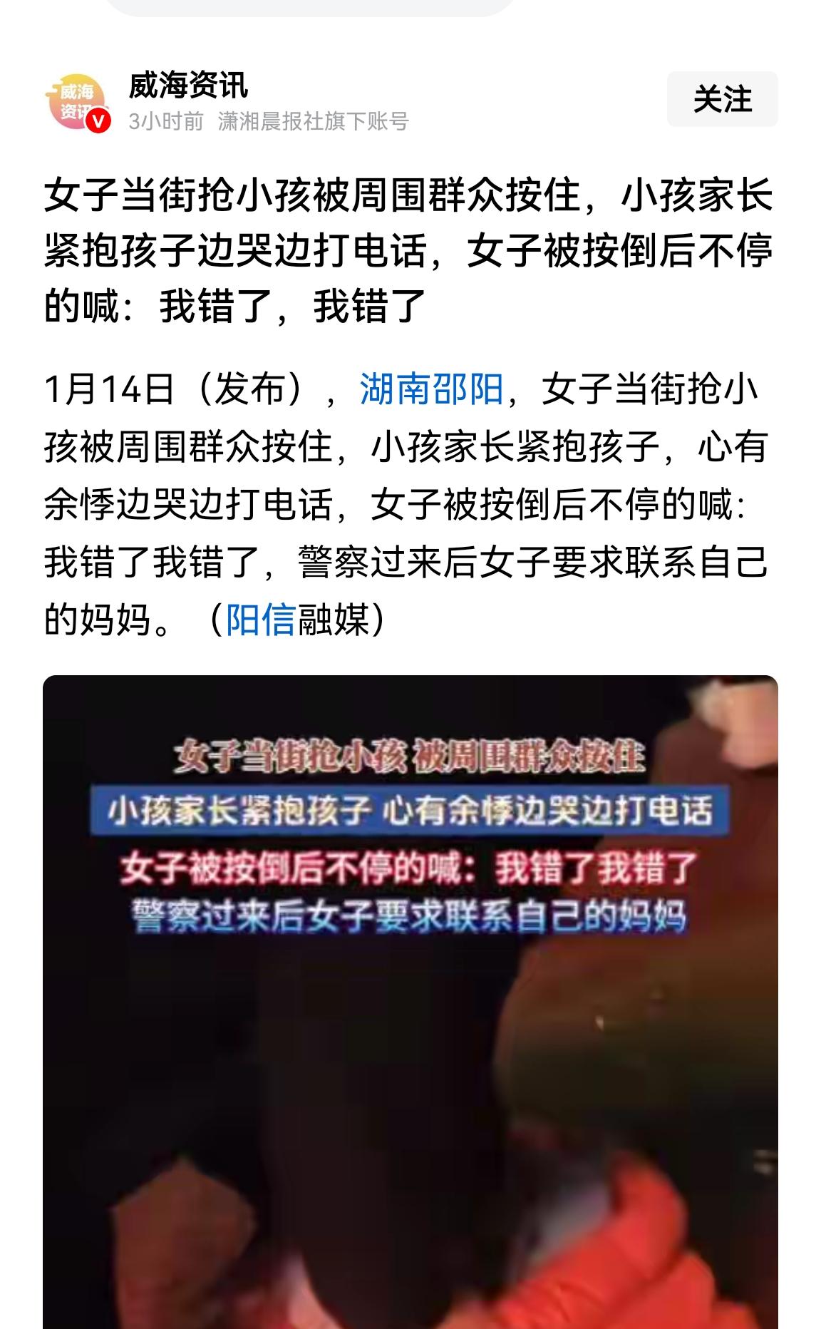现在居然还有抢夺小孩的。 14日发布邵阳,女子黑夜当街抢夺小孩,被热心群众团团围住。 小孩家长赶来抱回孩子,只见抢夺小孩女子不停喊到,她再也不抢孩子。但湖南热心群众依然把她牢牢控制住,一直等到警察到来。 最后抢夺孩子的红衣女子要求警察联系自己的母亲。 还有一个月就要春节了,人员流动较大,大家出门在外时,一定不要让年龄小的孩子远离自己的视线。 安全才是最大的团圆。