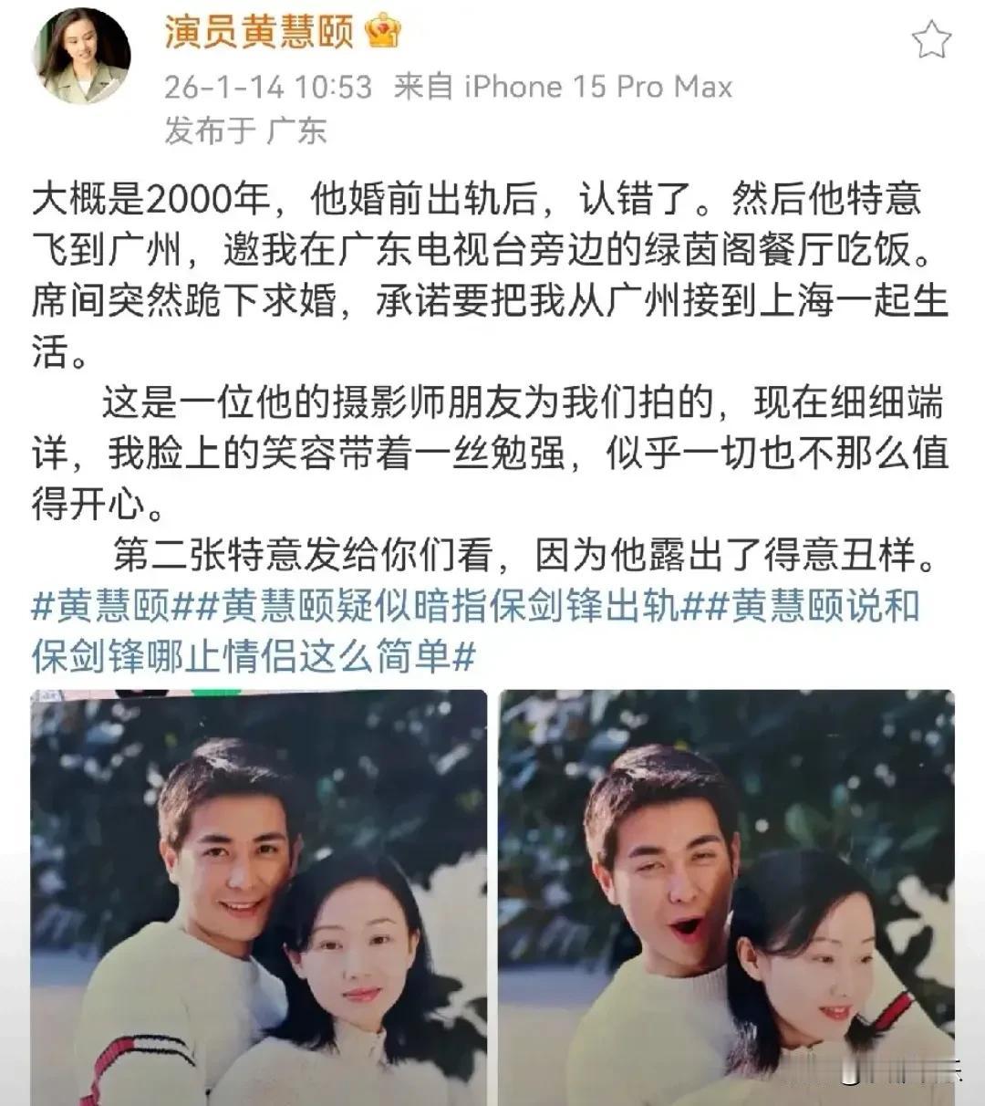 娱乐圈的“旧账本”又添新篇! “祝婉玲”黄慧颐突然发文,手撕旧爱保剑锋。她说啥?指认保剑锋婚前出轨,出完轨还转头向她求了婚。更绝的是,她爆料两人早在2001年就悄摸摸领了证,没婚礼没婚纱。这藏的,比狗仔队还深! 另一边呢?保剑锋工作室火速发声明:全是假的,律师已在路上。保剑锋自己也好像被气笑了,发微博吐槽编故事也得编高级点。两边彻底杠上。 黄慧颐说,自己退让多年,现在连条“活路”都不给留,是不是怕影响他1月18号的新剧?怕观众发现剧里演“忠臣”的,其实是… 话里话外,信息量巨大。 看看现在,一边是新剧宣传风光无限,另一边是57岁的黄慧颐,被拍到在老家广州打理一家小小的旧书店,容颜已老。这场跨越二十年的罗生门,真叫人唏嘘。 戏里演的是人生,戏外过的才是日子。人设演得再完美,不如活得真实坦荡一点。 黄慧颐爆料保剑锋婚前出轨 保剑锋