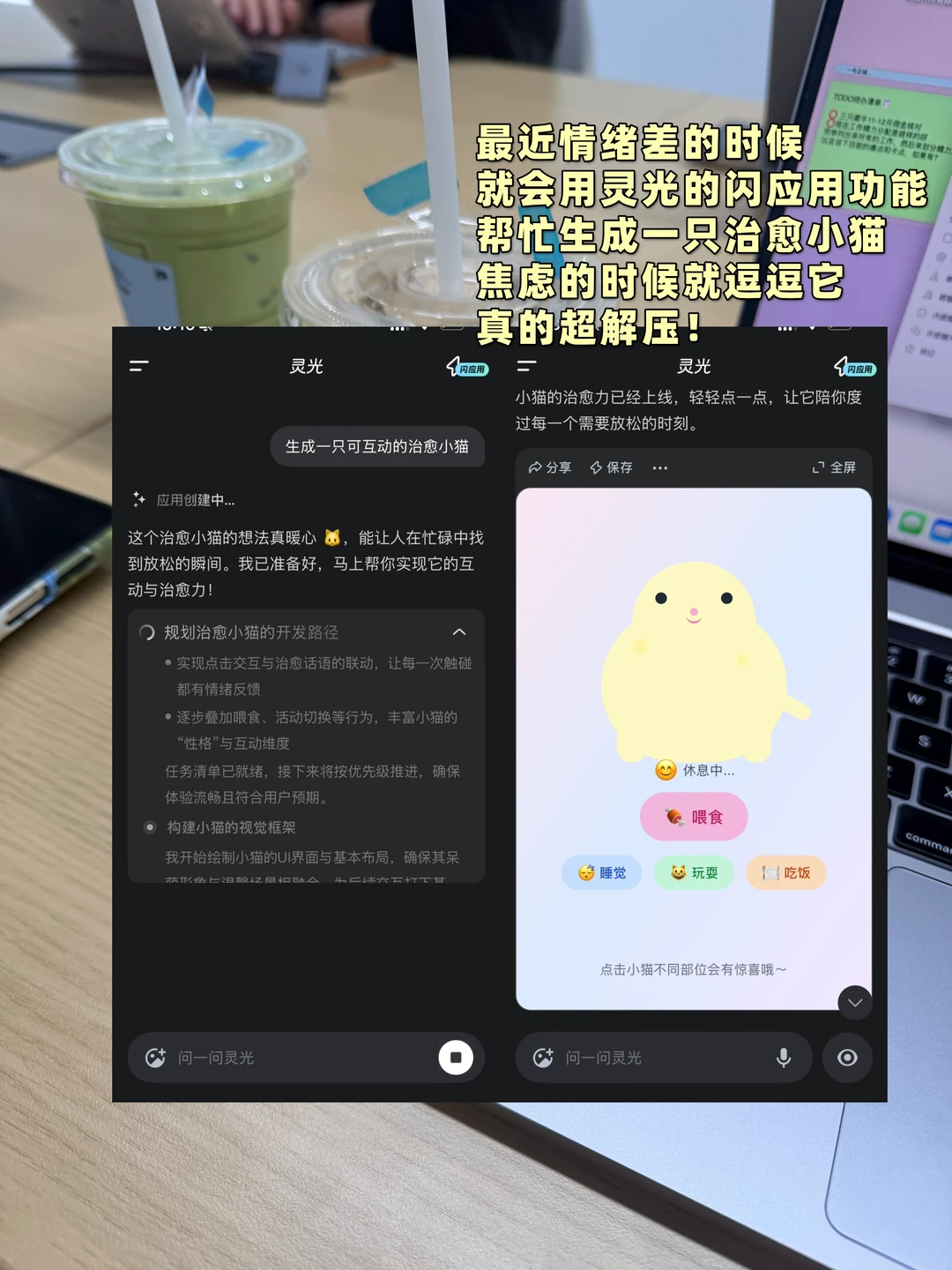 最近情绪差的时候,就会用灵光的闪应用功能帮忙生成一只治愈小猫,焦虑的时候就逗逗他,真的超解压