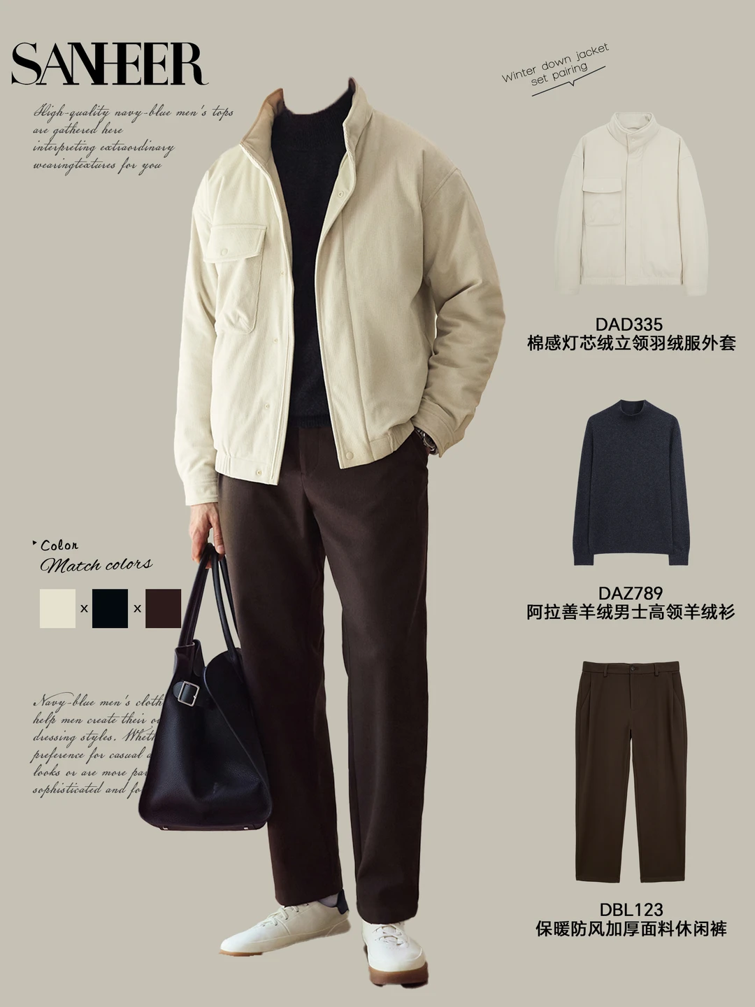 ▪️棕羽绒服 + 黑高领 + 灰裤:棕调 + 基础色,暖调显贵,托特包增加松弛感