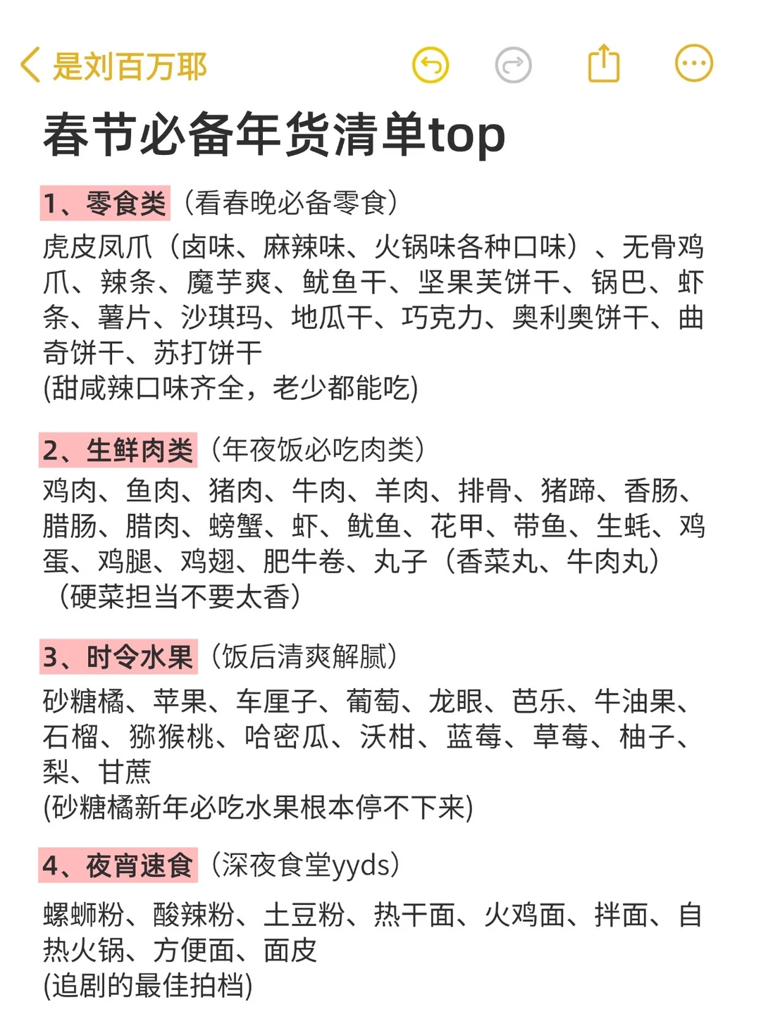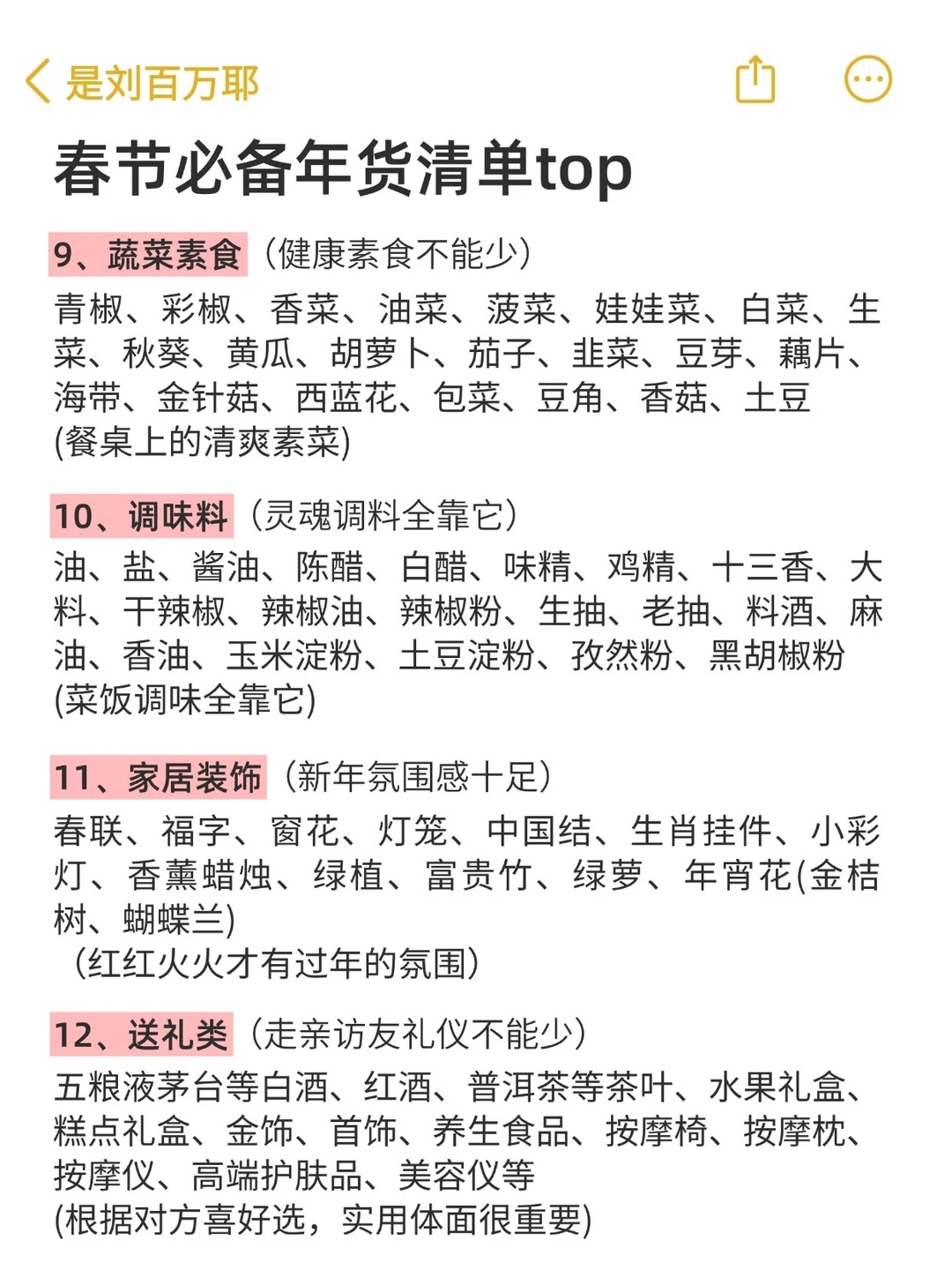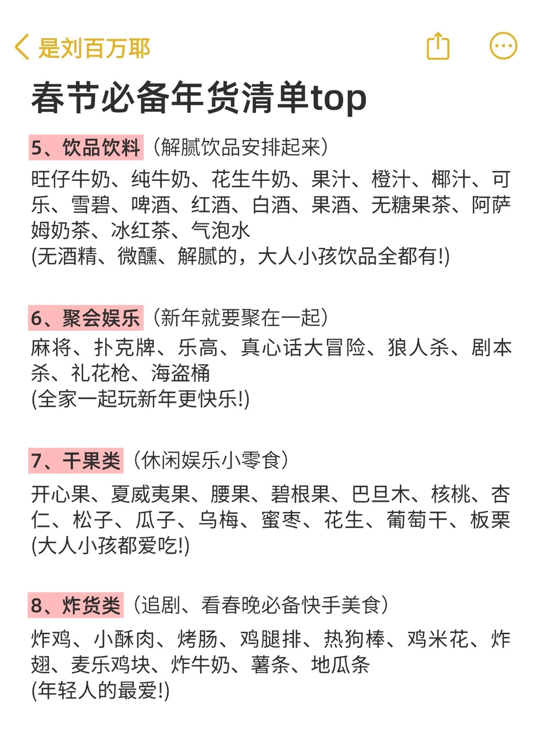 春节不知道买什么?今天给大家列出年货清单,照着买省心又省力,赶紧🐎住~ · 春节年货清单🧾 1️⃣零食干果🍫 2️⃣生鲜肉类🥩 3️⃣时令水果🥝 4️⃣夜宵速食🍱 5️⃣饮品饮料🥤 6️⃣聚餐娱乐 7️⃣干果类🥜 8️⃣炸货类🍤 9️⃣蔬菜素食🥒 1️⃣0️⃣调味料🧂 1️⃣1️⃣家居装饰🎍 1️⃣2️⃣送礼类🎁