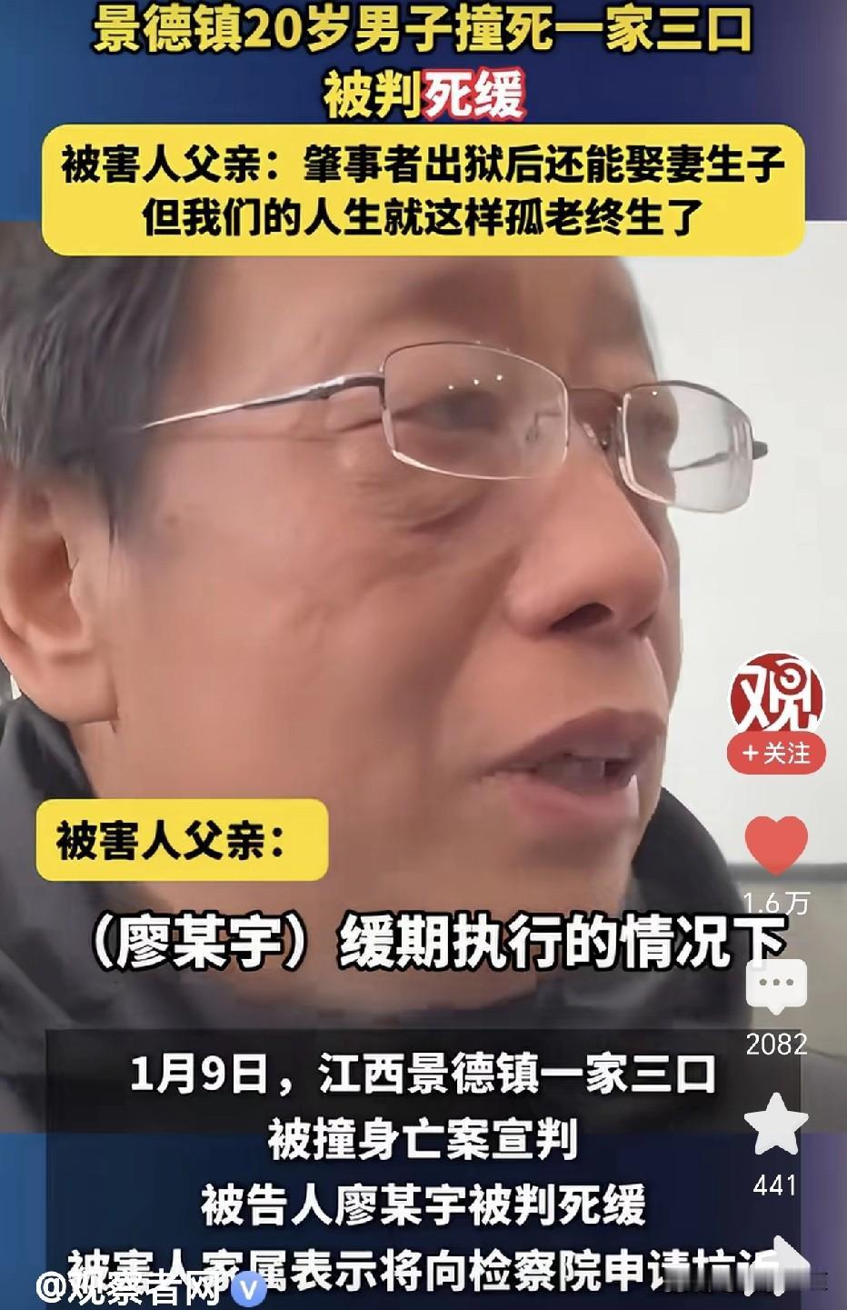 景德镇20岁男子撞死一家三口被判死缓,被害人父亲:肇事者出狱后还能娶妻生子,我们的人生在哪里?我们会孤独终老! 2024年10月2日,国庆假期的第二天,景德镇昌江大道上车流不息,人们都在享受难得的假期时光。然而,一场悲剧正在悄然酝酿。 当天18时42分,31岁的胡先生怀抱着不满周岁的儿子,挽着30岁妻子王女士的手,正穿过马路赶往父母家吃晚饭。 此时在马路的另一端,20岁的廖某宇正驾驶着一辆白色特斯拉Model3电动车,与同车女友因“鹦鹉是何时开始学舌”的问题发生争吵。 争吵中,廖某宇心生闷气,将负面情绪倾泻在了油门上。绿灯亮起后,他猛踩加速踏板,短短14秒内,车速从0.32公里/小时飙升至128.96公里/小时,是该路段限速40公里/小时的3倍多。 女友孙某惊恐万分,多次劝阻,但廖某宇置若罔闻,短暂减速后又再次猛踩油门。最终,他以107.28公里/小时的速度,撞上了正在过马路的胡先生一家三口。 不满1岁的男婴当场殒命,王女士经现场抢救无效死亡,胡先生被紧急送医后也没能挺过来。三条鲜活的生命,在瞬间消逝。 让胡先生父母愤怒的是,肇事司机廖某宇的父亲不仅没有表现出应有的歉意,反而多次联系他们,提出赔偿80万元,并承诺将来让儿子出狱后为他们养老送终。 胡先生表示,儿子、儿媳、孙子三条鲜活的生命,岂是80万元可以衡量?让杀害自己至亲的凶手将来为自己养老,这不是侮辱又是什么! 廖某宇的父亲甚至声称:“你们一家三口死是天灾,一直追着我儿子要求他死刑不放是人祸。”还威胁“让受害者全家死得干净”。这些言行,无疑是在受害者家属的伤口上撒盐。 2026年1月9日,案件一审宣判,廖某宇因“以危险方法危害公共安全罪”判处死刑缓期两年执行。对于这一判决结果,受害人家属无法接受。 @法律有道 一、罪名认定的分析 本案控辩双方围绕被告人廖某宇的行为构成以危险方法危害公共安全罪还是交通肇事罪展开了激烈辩论。 但最终法院认定廖某宇的行为构成以危险方法危害公共安全罪的原因: 1、主观上的间接故意。廖某宇案发前曾驾驶车辆向朋友展示肇事车辆加速性能,知晓车辆加速性能突出。他也知晓昌江大道属于城市主干道且有限速规定,案发时又正值节假日晚高峰,应当认识到在人流车流密集的城市主干道上严重超速行驶的重大危险。 超速行驶后不顾同乘人员劝阻仍持续加速,在看见被害人后虽采取了紧急制动和打方向盘的避让措施,但因车速极快,客观上已无法避免危害后果的发生。因此,自严重超速驾驶之时起,廖某宇主观上对公共安全即持不管不顾的放任心态,属于间接故意,而非过失心态。 2、客观上的危险行为。廖某宇于节假日晚高峰在城市主干道严重超速驾驶的行为,对公共安全形成严重威胁和现实危险,危险程度极高且无法有效控制,不特定社会公众对此难以预见和避免,并实际造成了三人死亡的特别严重后果,属于以危险方法危害公共安全罪的“其他危险方法”。 司法鉴定意见书显示,廖某宇在油门踩到底的状态下,车速达到128.96公里/小时,2秒后与行人发生碰撞,撞击时车速为107.28公里/小时。撞击前2秒,廖某宇开始采取避险措施,车辆向右打方向后,向左急打方向,最终车辆在撞击发生5秒后停止。 这表明廖某宇的行为具有高度的危险性和破坏性,与放火、爆炸等危险方法的危险性相当。 3. 社会危害性。廖某宇的行为造成了三人死亡的特别严重后果,给受害者家庭带来了巨大的痛苦和损失,也对社会公共安全造成了严重的威胁。这种行为不仅侵犯了受害者的生命权和健康权,也破坏了社会的正常秩序和公共安全,具有极大的社会危害性。 二、为何是死缓而非死刑立即执行 法院审理认为,被告人其行为已构成以危险方法危害公共安全罪。但最终并未判处廖某宇死刑立即执行,而是判处死刑,缓期二年执行。主要基于以下几个因素: 1、间接故意而非直接故意:法院认为,廖某宇在看到被害人后采取了紧急制动和打方向盘的避让措施,说明他并非积极追求被害人死亡的结果,而是对危害结果的发生持放任态度,属于间接故意。与蓄意驾车冲撞人群的直接故意犯罪相比,其主观恶性和人身危险性相对较小。 2、自首情节:案发后,廖某宇先后拨打了急救和报警电话,并在现场等候处理,到案后如实交代了自己的主要犯罪事实,构成自首。 3、认罪态度:庭审中,廖某宇对自己的犯罪事实供认不讳,并表示愿意接受法律的制裁。 三、受害者家属的抗诉之路 对于这一判决结果,受害者家属表示强烈不满,并决定向检察院申请抗诉。胡先生的父亲在接受采访时表示:“他缓期执行的情况下,坐牢15年,再加2年,也就17年,他出狱的时候也就39岁,他还可以享受自由的空气,还可以与家人共同生活,他还能娶妻生子。我们两个人60多岁了,独子独孙就这样没了,我们的人生在哪里?我们会孤老终生。” 目前,受害者家属已启动抗诉程序。