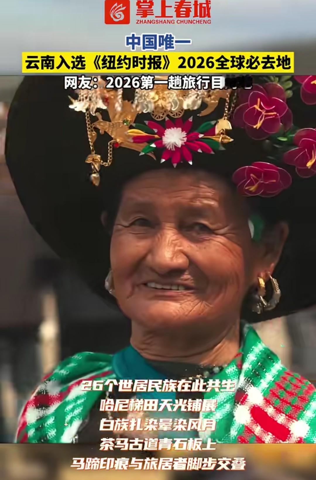 厉害了,大美云南! 云南入选《纽约时报》2026年全球必去地,这是中国唯一入选的地方。 作为一个云南人,心里还挺骄傲和自豪的,这里有众多美景,让人里流连忘返! 还有一个月就是春节了,大家春节期间想要去哪里玩?欢迎大家来云南玩啊!