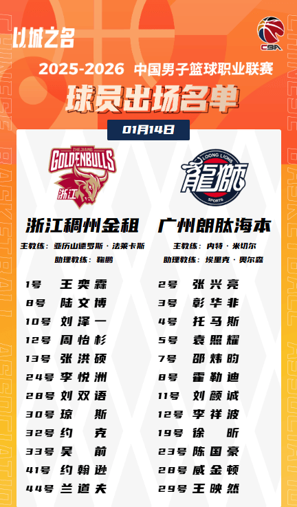 虎扑01月14日讯今晚CBA常规赛,广州对阵浙江的大名单已经公布。