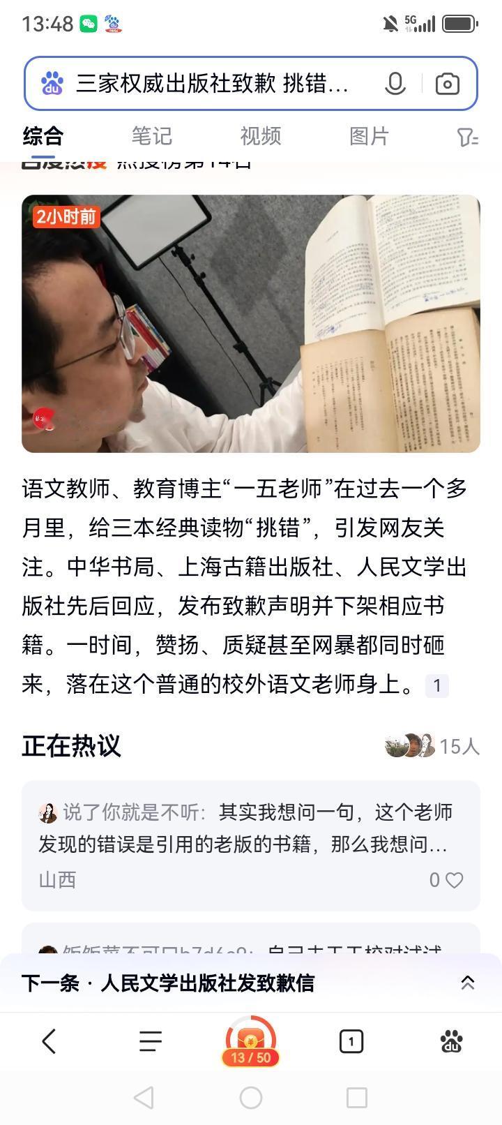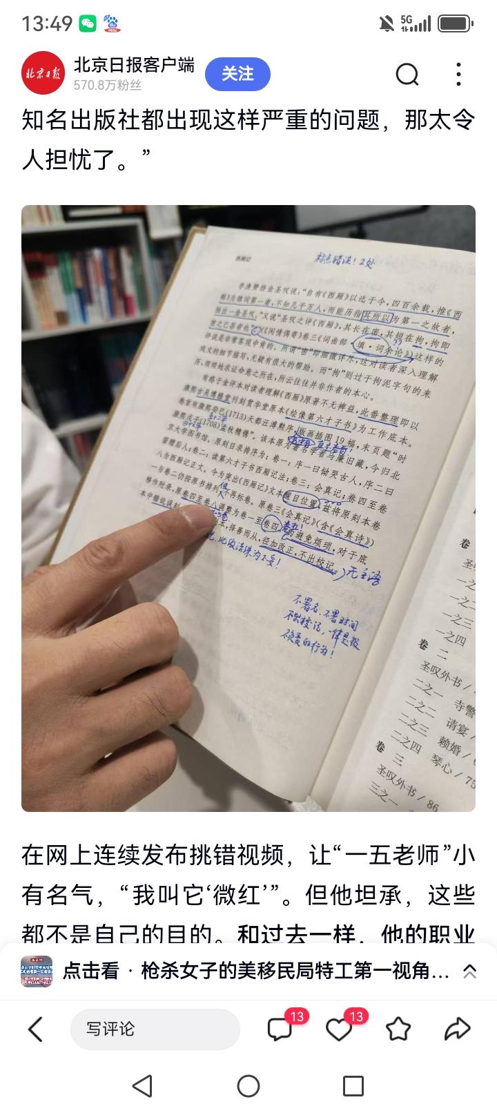 博主给经典读物挑错 三大出版社回应致歉 网上一位叫“一五老师”的博主通过给经典