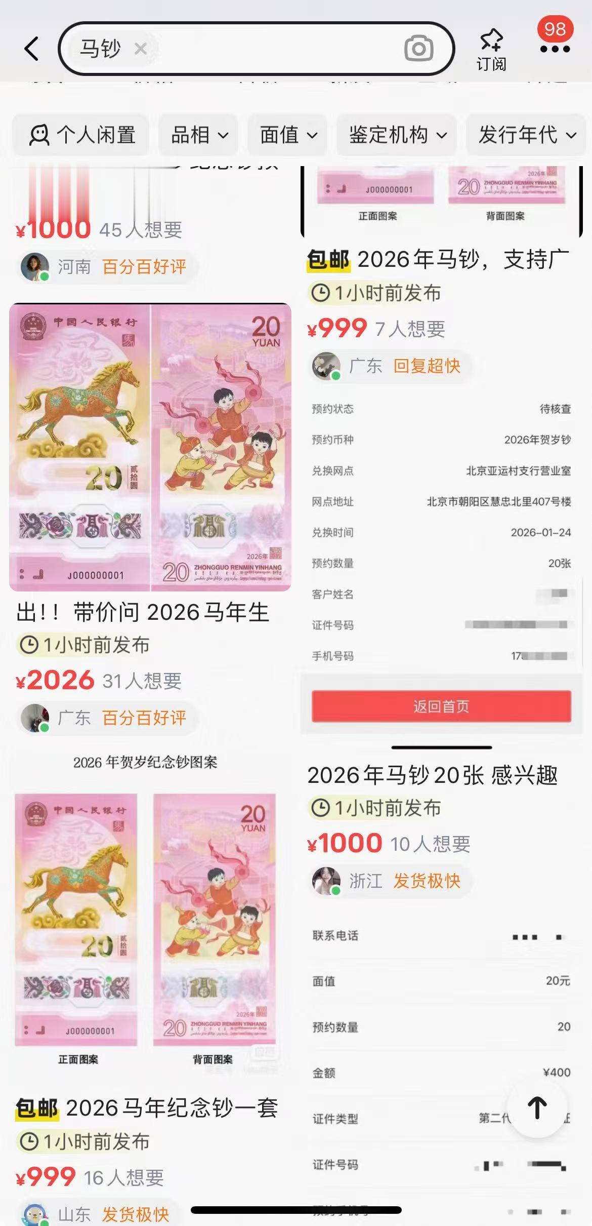 收藏市场对此反应迅速。据悉,纪念币/钞在线上实名预约后,还要通过核实确认预约者资格,才能在1月20日至1月26日线下兑换。尽管纪念币/钞尚未进入实物兑换阶段,但其在二级市场上的价格和交易关注度已显著升温。在二手交易平台上,已出现大量声称高价回收“马钞”“马币”的帖子。
