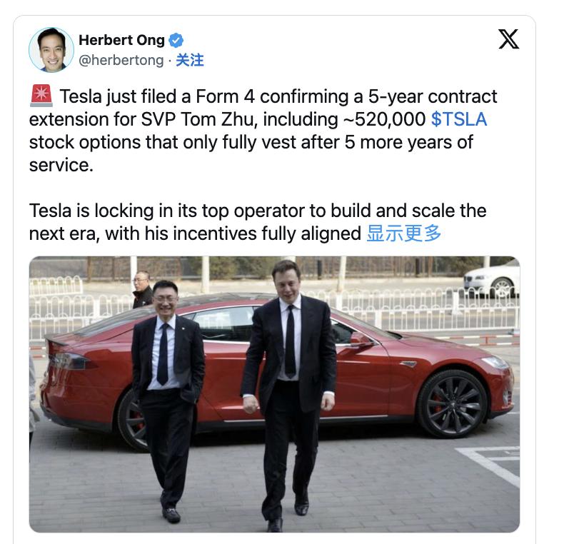 52万份股票激励,特斯拉为何在此时许诺朱晓彤巨额奖励? 特斯拉在最近提交给监管机构的文件中披露了一项慷慨的股权奖励,汽车业务高级副总裁朱晓彤获得了520,021份股票期权,行权价格为每股435.80美元,由于这笔奖励要到2031年3月5日才能完全解锁,所以朱晓彤至少要再给特斯拉效力5年才能获得全部奖励。 按照目前每股445-450美元计算,这笔奖励超过2.3亿美元。当然前提是未来五年特斯拉股价和业绩依然保持增长,如果马斯克能够完成CEO绩效奖中设定的市值目标,那么朱晓彤就会成为亿万富翁。 突然给这么大一个甜饼,当然不是什么普通的“年终奖励”,考虑到最近一年内特斯拉高管人才的大范围流失,马斯克是在为公司锁定顶尖人才。 朱晓彤2014年4月加入特斯拉,最初负责公司在中国的超级充电站推广工作。同年晚些时候,他接管了特斯拉中国业务,在特斯拉的本土化工作中发挥了核心作用,包括拓展零售和服务网络,后来又负责上海超级工厂的建设。 朱晓彤帮助特斯拉将中国打造成为其最重要的市场和生产中心之一。2023年,特斯拉提拔他为汽车业务高级副总裁,使其跻身公司全球核心高管之列,并将影响力扩展到中国以外的地区。此后,他赢得了公司“问题解决者”的美誉,并被马斯克委以重任,帮助提升位于德克萨斯州的超级工厂的汽车产能。 所以特斯拉给朱晓彤的大礼包,正是为了迎接其迄今为止最具雄心壮志的发展时代。正如马斯克2025年的薪酬方案展示的,特斯拉的目标是成为全球市值最高的公司,并力求实现前所未有的生产水平。朱晓彤的才能无疑将在特斯拉这一阶段发展中发挥重要作用。【来自懂车帝车友圈】