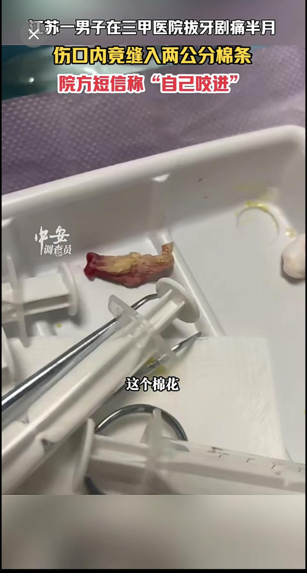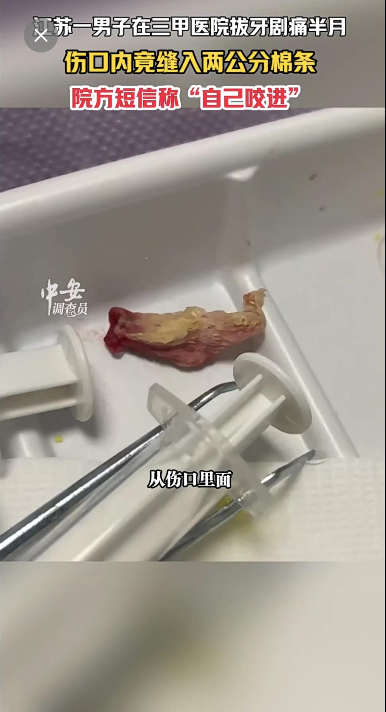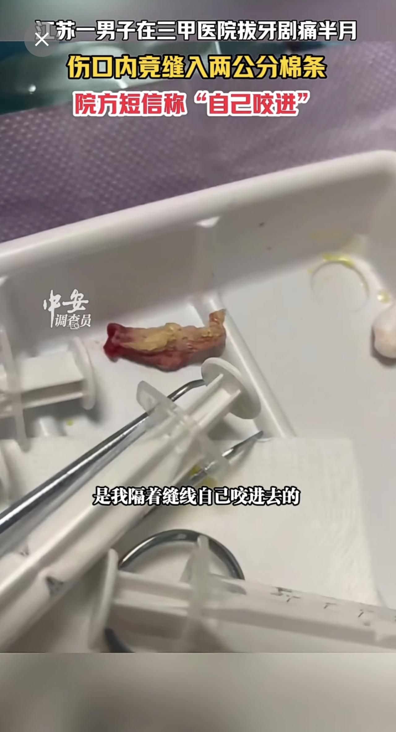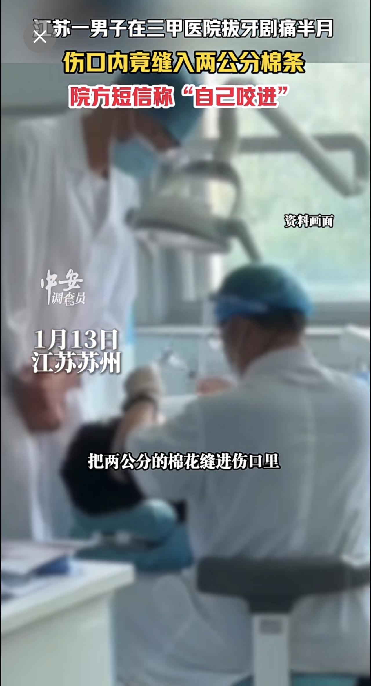 1月13日江苏苏州,江苏一男子在三甲医院拔牙剧痛半月,伤口内竟缝入两公分棉条,院