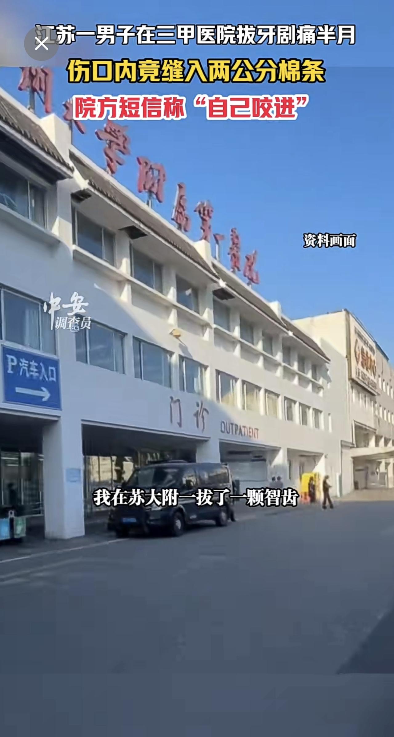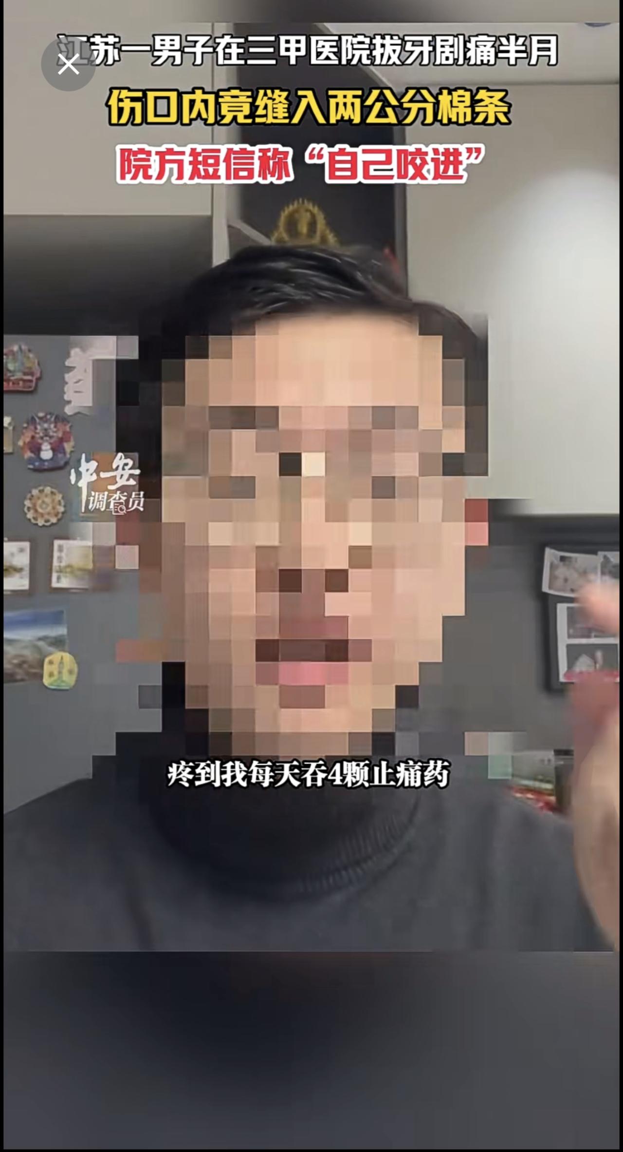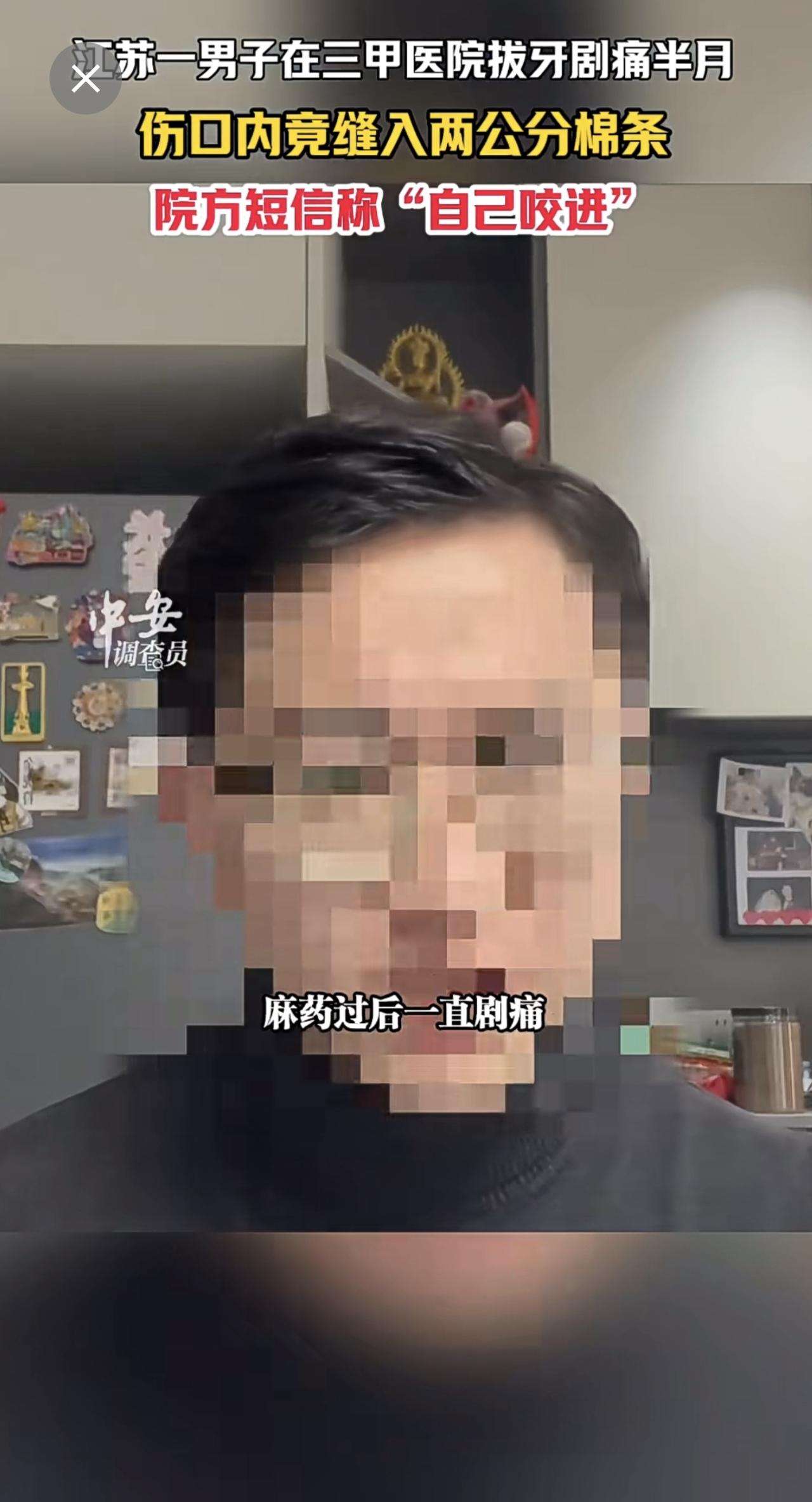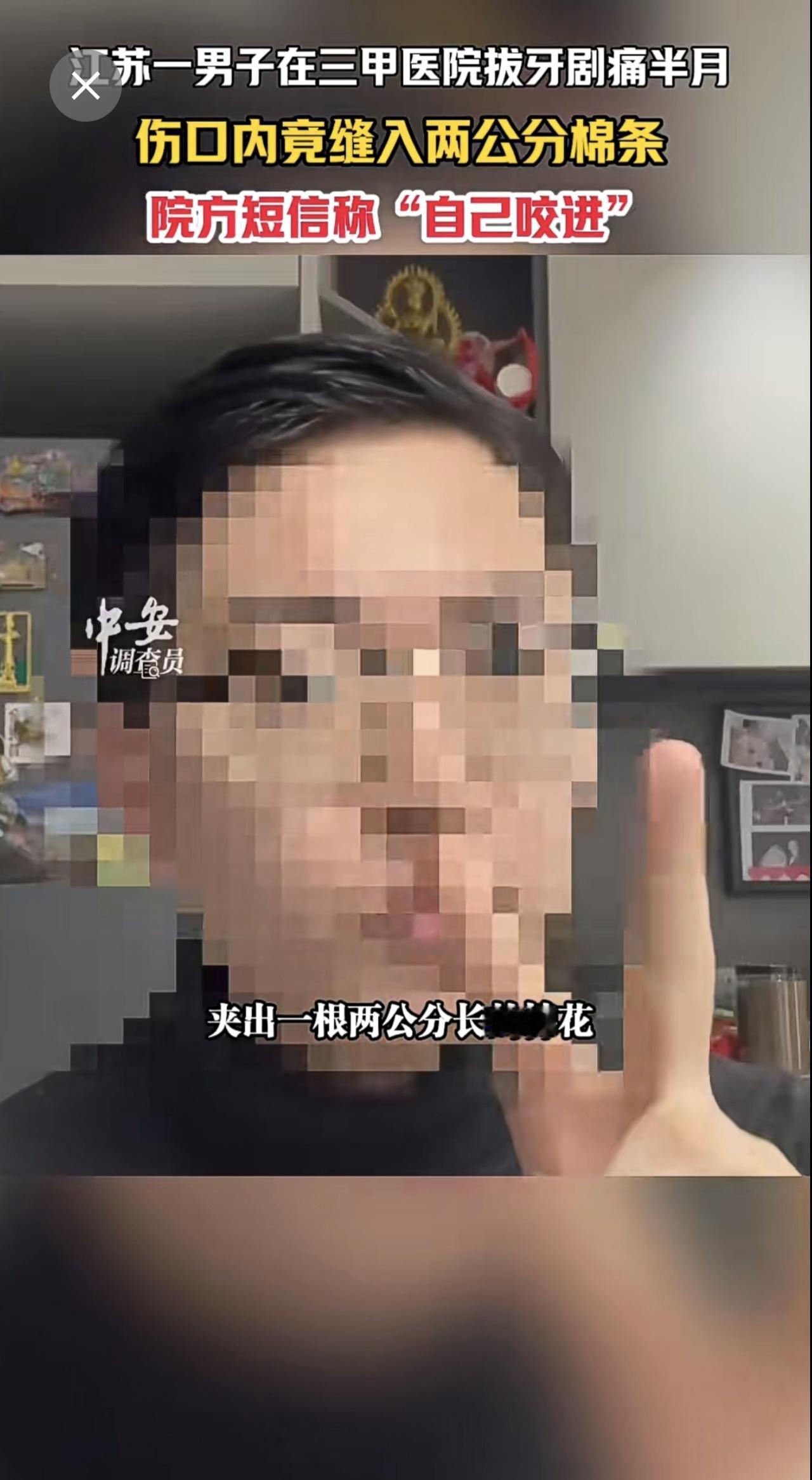 1月13日江苏苏州,江苏一男子在三甲医院拔牙剧痛半月,伤口内竟缝入两公分棉条,院