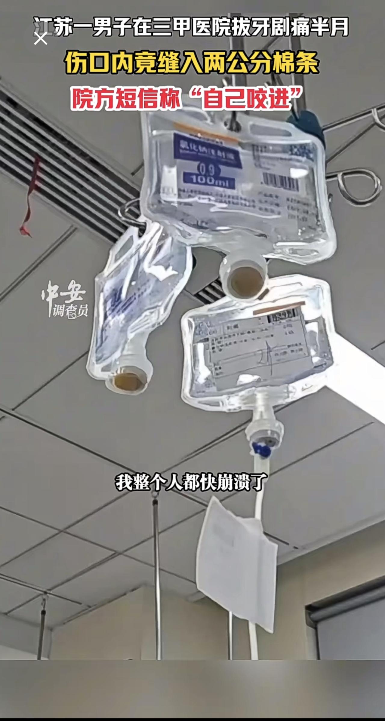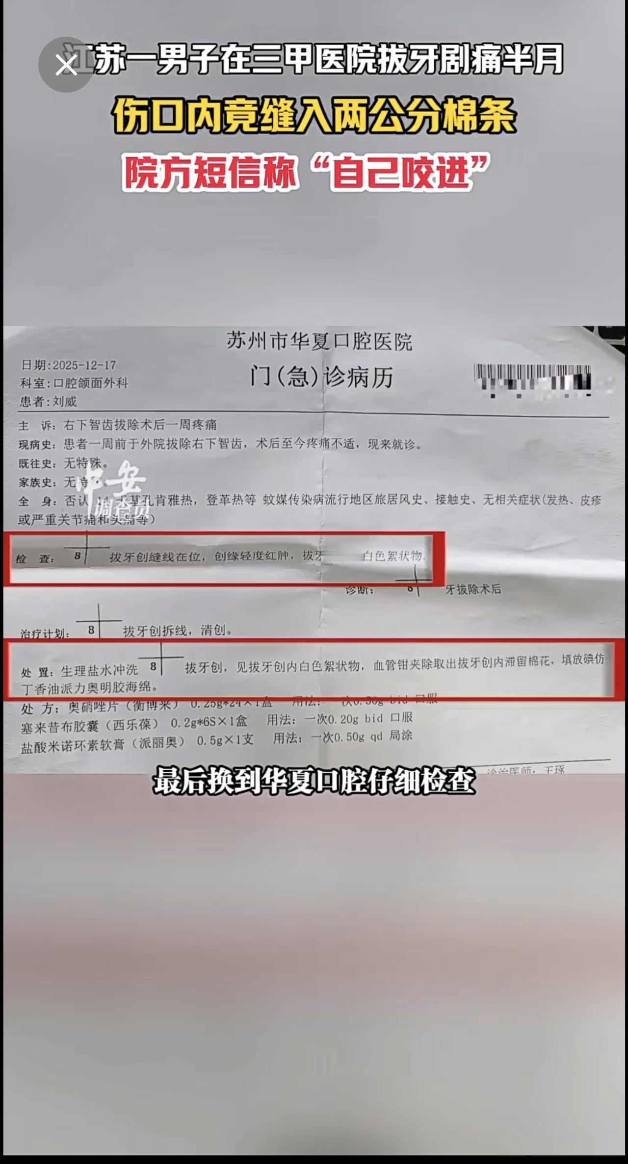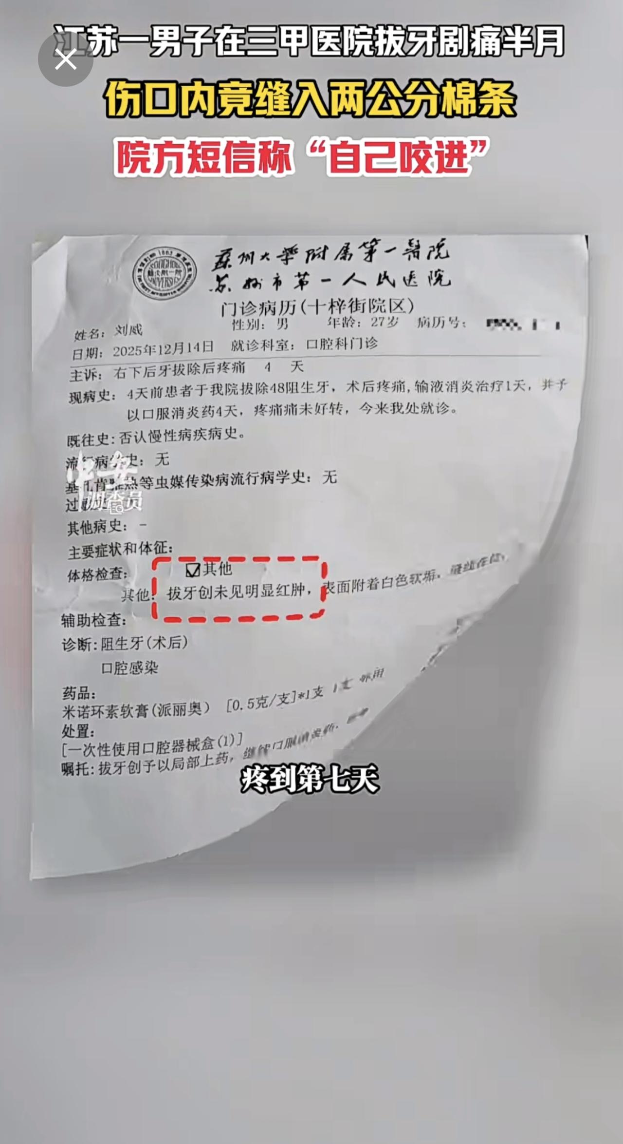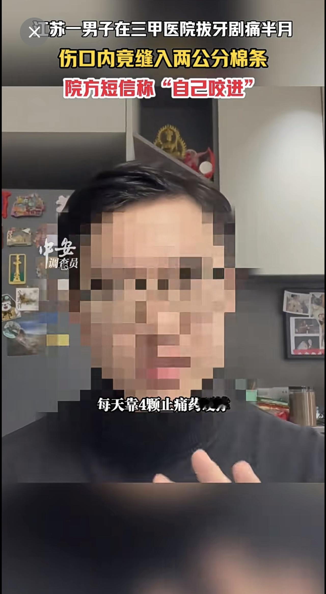 1月13日江苏苏州,江苏一男子在三甲医院拔牙剧痛半月,伤口内竟缝入两公分棉条,院