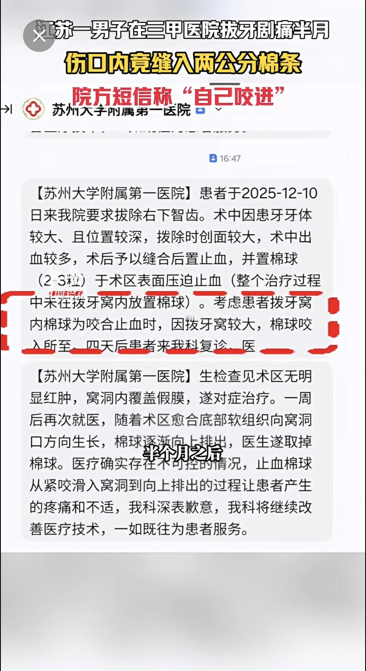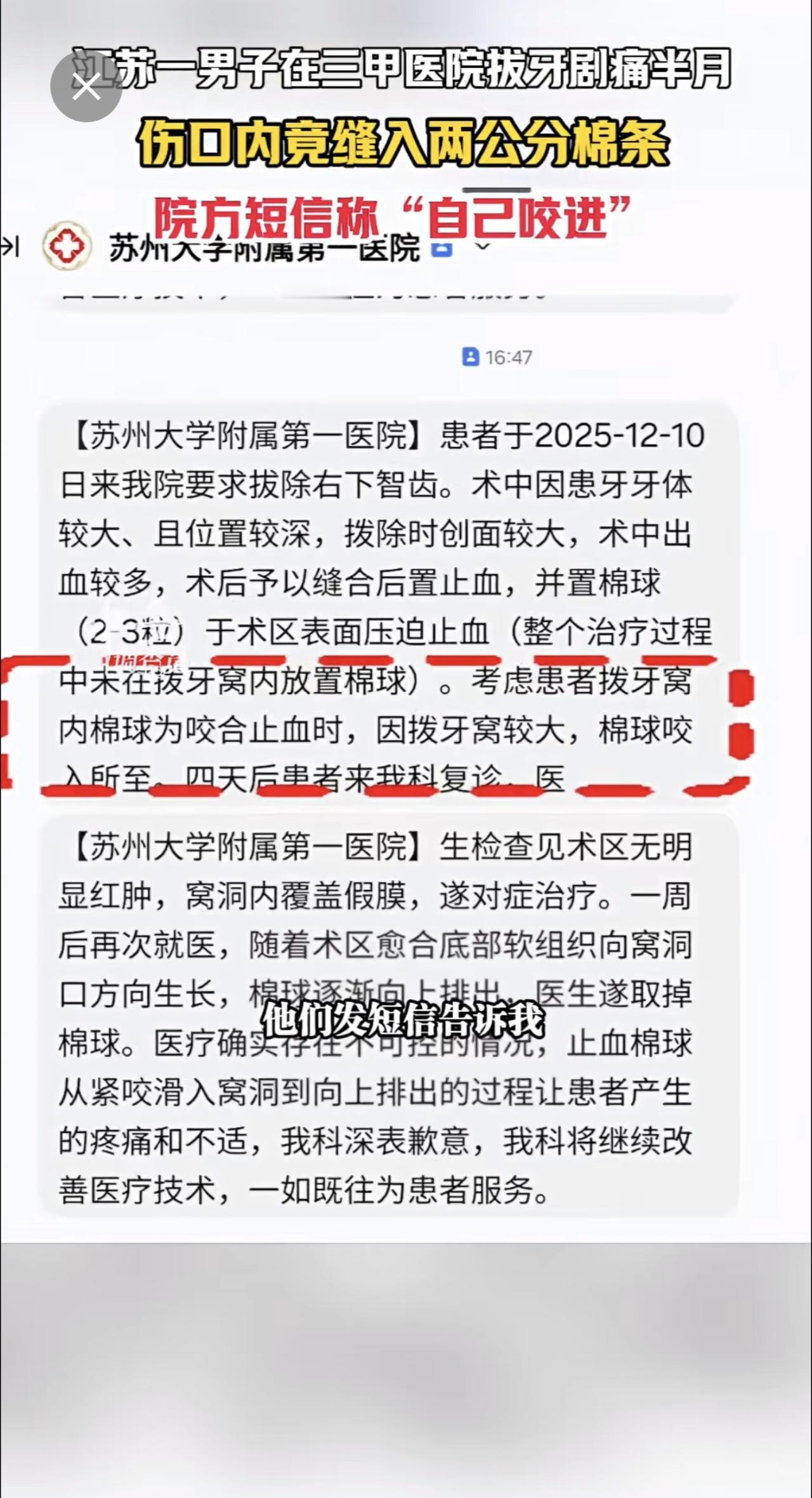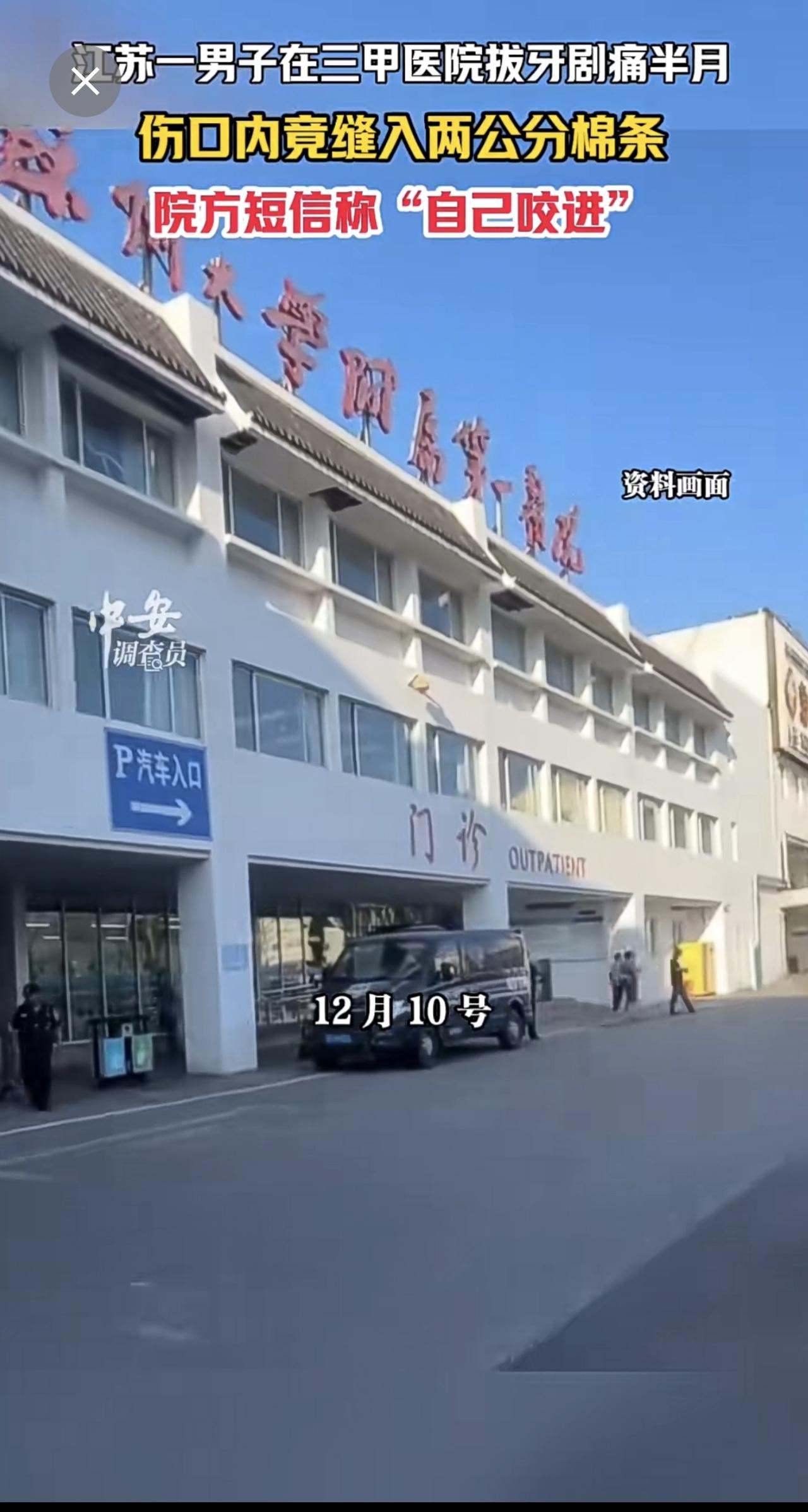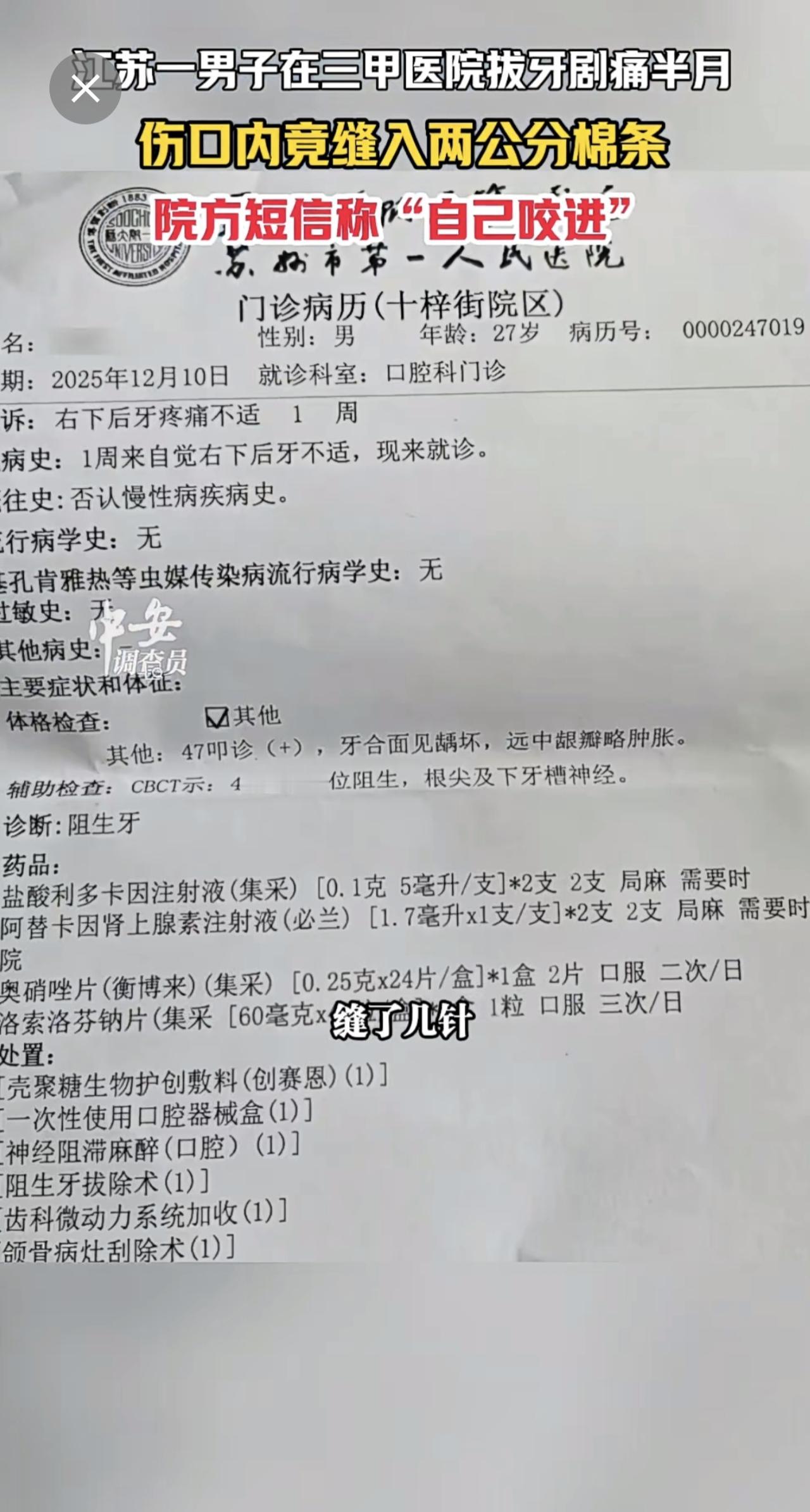 1月13日江苏苏州,江苏一男子在三甲医院拔牙剧痛半月,伤口内竟缝入两公分棉条,院
