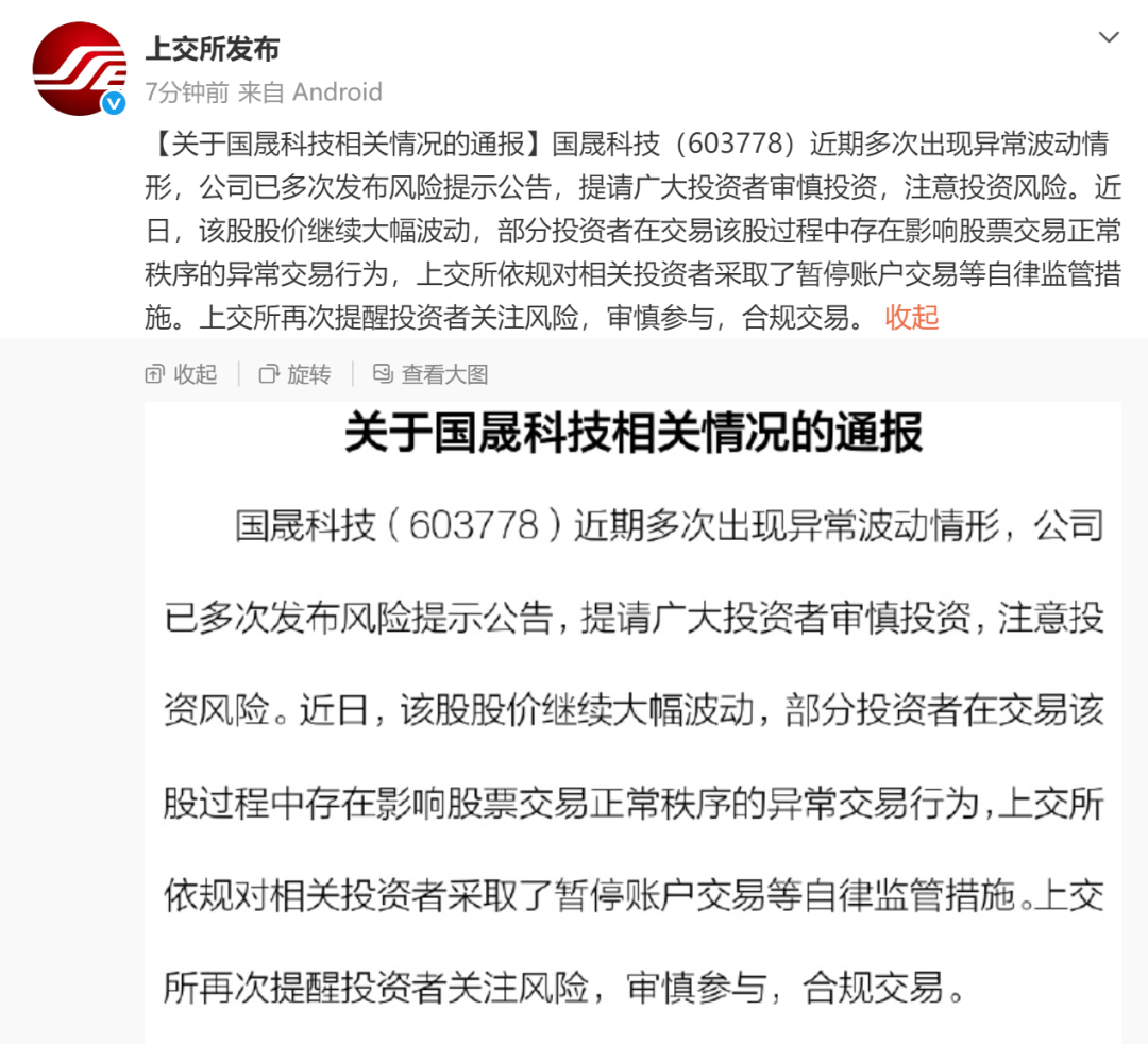 据上交所官方微博,国晟科技近期多次出现异常波动情形,公司已多次发布风险提示公告,提请广大投资者审慎投资,注意投资风险。近日,该股股价继续大幅波动,部分投资者在交易该股过程中存在影响股票交易正常秩序的异常交易行为,上交所依规对相关投资者采取了暂停账户交易等自律监管措施。上交所再次提醒投资者关注风险,审慎参与,合规交易。