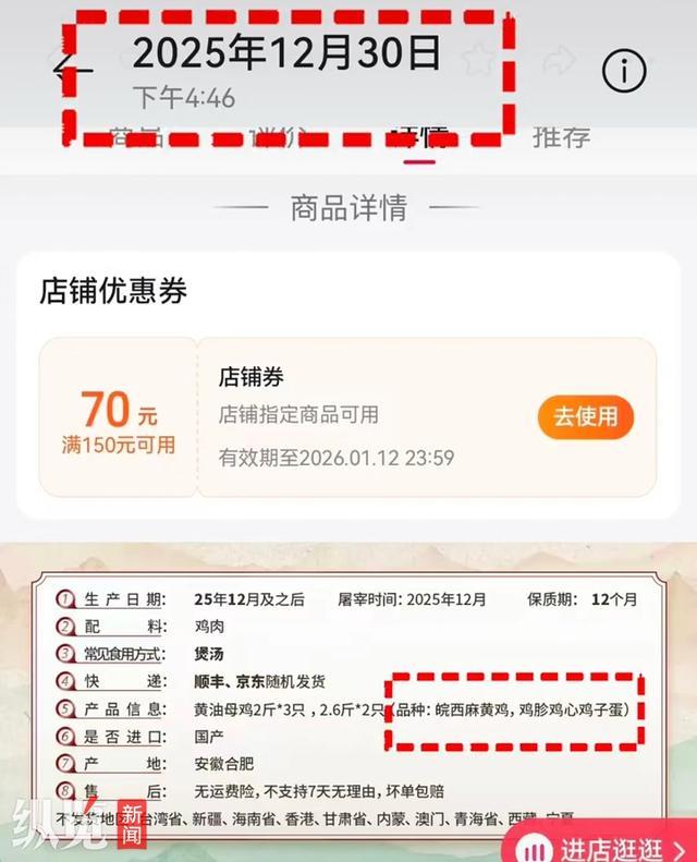 李先生说,2025年12月30日,他在某电商平台看到,在该商品详情页面产品信息一栏写道:黄油母鸡2斤*3只,2.6斤*2只(品种:皖西麻黄鸡,鸡胗鸡心鸡子蛋)。12月31日,他发现该产品信息突然被删除。今年1月初,李先生购买了这款产品,他表示,从鸡的外观来看,与皖西麻黄鸡存在明显差别。皖西麻黄鸡的鸡喙、鸡脚和鸡爪都是青黑色,而这款“大别山黄油老母鸡”并不符合这些特征。他还认为,83.8元3只的价格,远低于市场价格,不可能是皖西麻黄鸡。