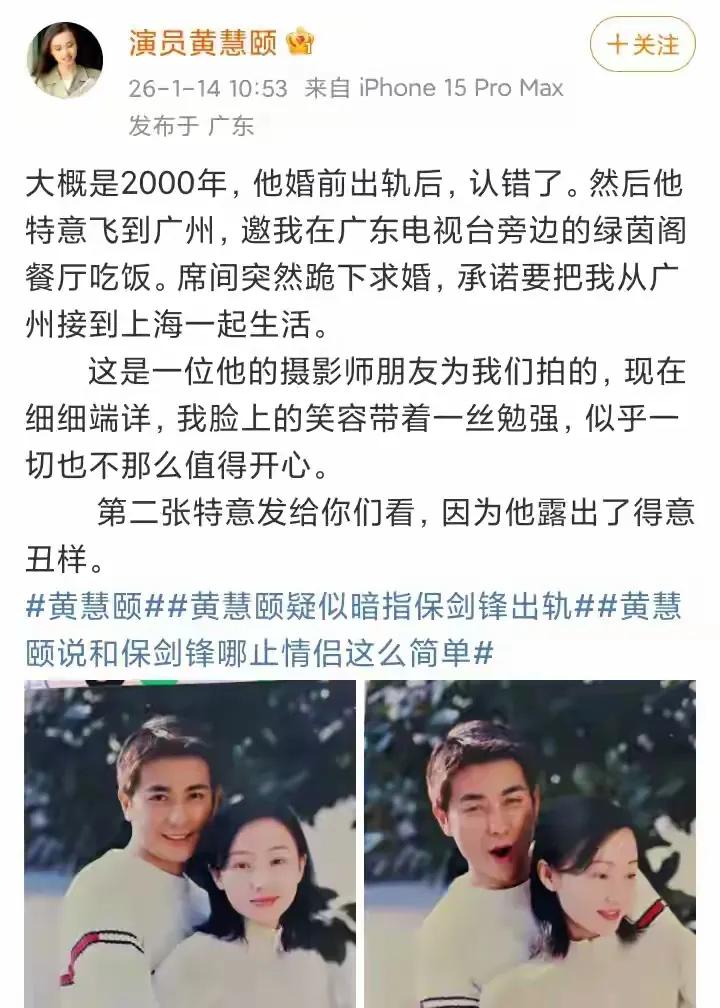 黄慧颐骂保剑锋“得意的丑样”,前妻黄慧颐公布保剑锋婚内出轨,保剑锋不买账,已经发声明,一刚到底。四个重要信息曝光: 黄慧颐是保剑锋的前妻,今天才知道。 1、娱乐圈感情复杂,没想到沉寂20年的黄慧颐公开爆料她与保剑锋有过一段婚姻,两人于2001年8月28日领证。 两人没有婚礼,黄慧颐好清瘦,穿粉色吊带,头上戴着一支玫瑰花。 保剑锋穿一件黑色衫,坐在沙发上,没有交流,尤其是保剑锋看起来一脸不开心的样子。 这背后是有故事的。 2、黄慧颐透露领证之前,保剑锋已经“出轨”,后来男方跑到广州下跪求饶。 黄慧颐心软,原谅了,还留下了合影。 黄慧颐现在非常讨厌前夫,用得意的丑样来形容前夫。 不过保剑锋的颜值还是OK的。 而且那个时候他才26岁,大好青春年华。 3、黄慧颐此前透露,保剑锋与现任何珈好是婚内出轨。 原来第一次出轨后,第二次就顺其自然了。黄慧颐根本无法驾驭保剑锋。 结婚证领了隐婚多年,黄慧颐苦闷,今天爆料了,想必内心也释怀了。 4、夫妻一场,得饶人处且饶人,两人都不够大度,应该互相尊重。 这是娱乐圈最大的瓜。 直觉认为保剑锋前程不太会受到影响。
