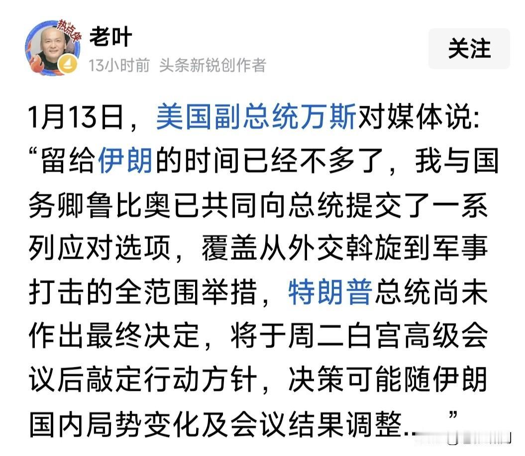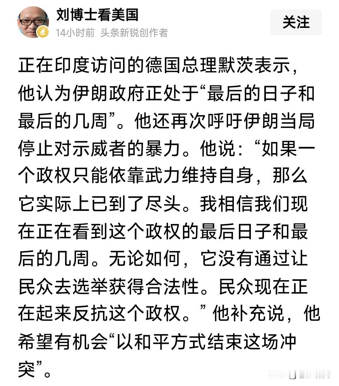 又有专家预测:美国轻易不敢动伊朗,军事代价远超委内瑞拉!美国的策略,主要是以压促变,改变现政权。 伊朗随后局势发展,是否依专家所言? 值得怀疑。因为此类预言大多不灵验。当年美军入侵伊拉克,张专家说“美将陷入战争泥潭”,结果两月解决。 去年叙利亚动乱,杜专家预测:阿萨德无忧,叙有俄伊强力支持,在叙有军事基地支撑,结果半年不到崩溃。 前时美军围堵委内瑞拉,李专家预测:委有俄强力支持,有俄式武器与防空系统,有军事顾问团。美军不敢把委怎么样!结果马杜罗被抓,委服软。 这次伊朗危机,不知能否如专家所愿?据称伊朗“已平息暴乱”,但局势仍不稳定。伊朗强硬谴责美以干涉内政,又表示愿与美“公平谈判”。但美却关闭所有会晤通道,积极准备对伊动手。 美国内政客支持对伊动武。万斯与卢比奥已制定“全部对伊行动选项”待川普选择,放言:留给伊朗时间不多了。 以色列议会也已授权尼亚胡,适时对伊朗实施打击。连在印度访问的默茨,都说伊朗神权只剩最后几周日子! 也许专家说的也对:美以若攻击伊朗将付出沉重代价!但他说的应该是地面进攻吧?但若美以采取对马杜罗或者对阿萨德方式呢?结果会是什么样? 总体来看,美以对伊朗冲突难免!但以什么方式?现在难以预测。应该不会发生大规模战争,可能以“不伤害平民”的形式?当然最好和平解决问题。 …………