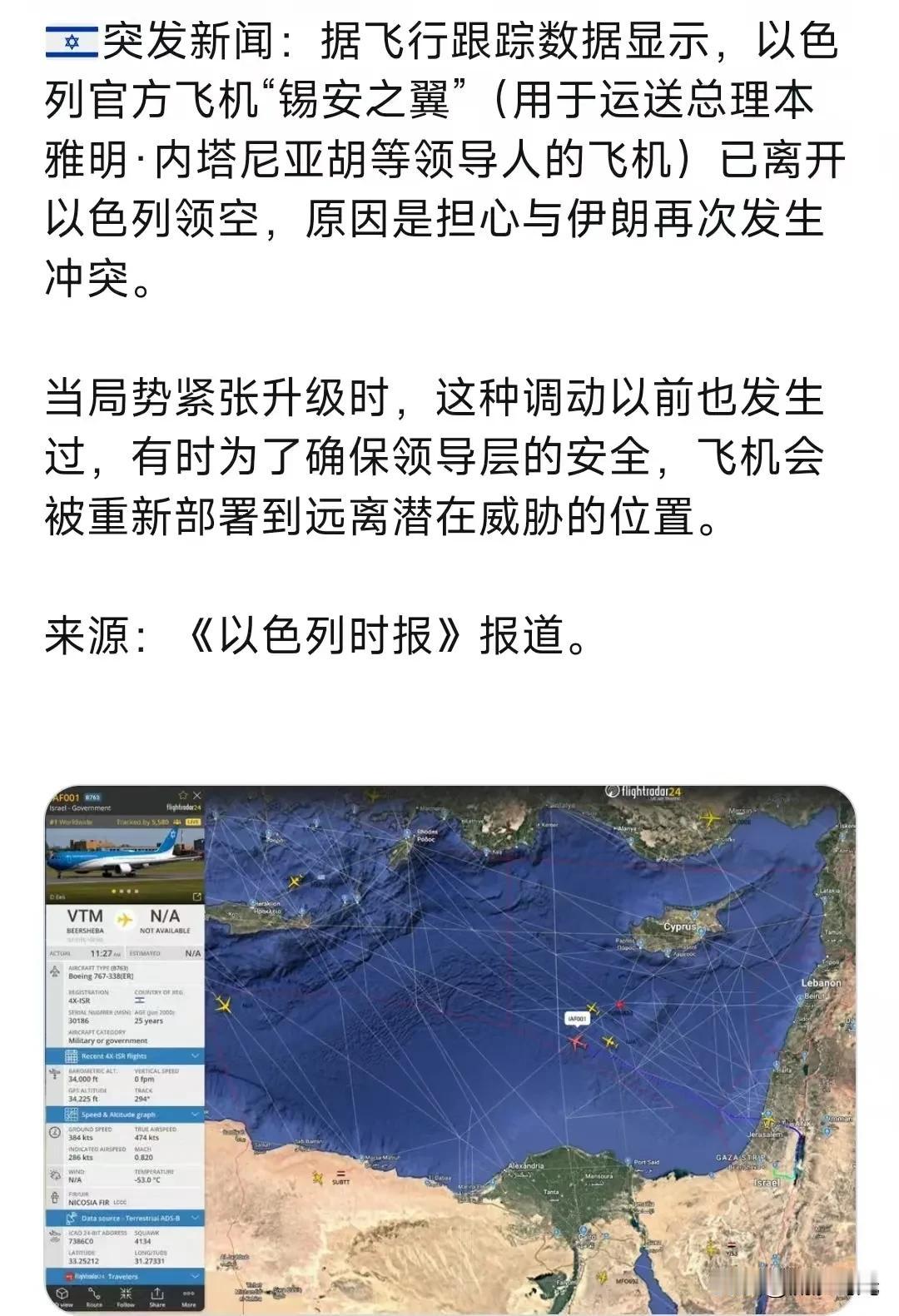 突发:据飞行跟踪数据显示,以色列官方飞机“锡安之翼”(用于运送总理本雅明·内塔尼亚胡等领导人的飞机)已离开以色列领空,原因是担心与伊朗再次发生冲突。当局势紧张升级时,这种调动以前也发生过,有时为了确保领导层的安全,飞机会被重新部署到远离潜在威胁的位置。来源:《以色列时报》报道。