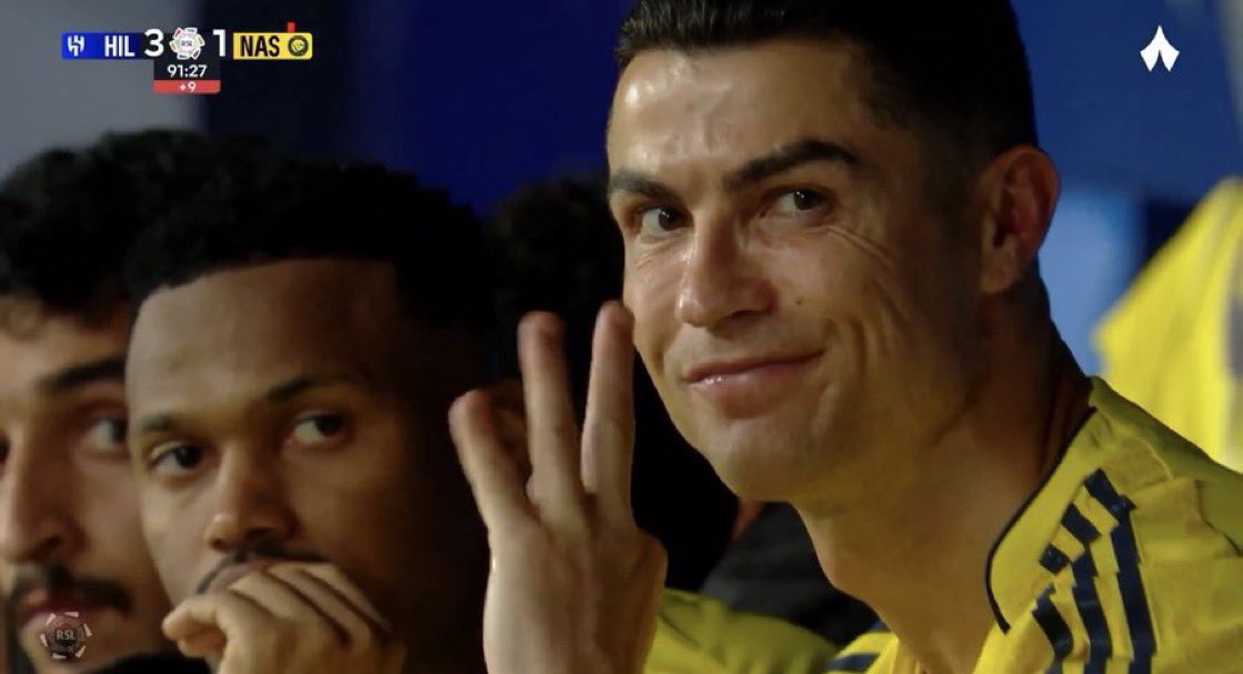 比起比分,更令人担忧的是C罗在比赛中的行为。据现场画面显示,他在新月打入第三球后,多次做出“被抢劫”的手势,暗示裁判偏袒对方、本方遭受不公。这一举动迅速引发沙特足协关注。