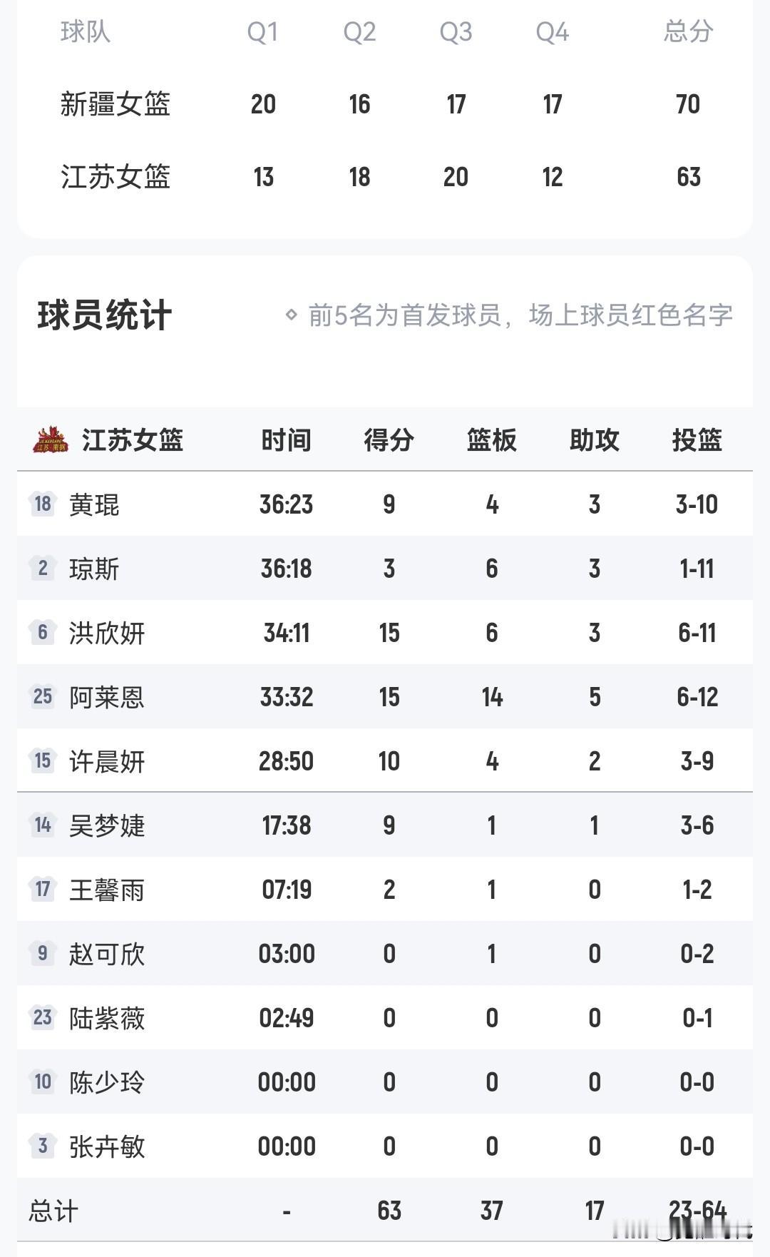 武桐桐21+7助 王雪朦18+7 新疆女篮70-63江苏女篮 龙欣妍15+6