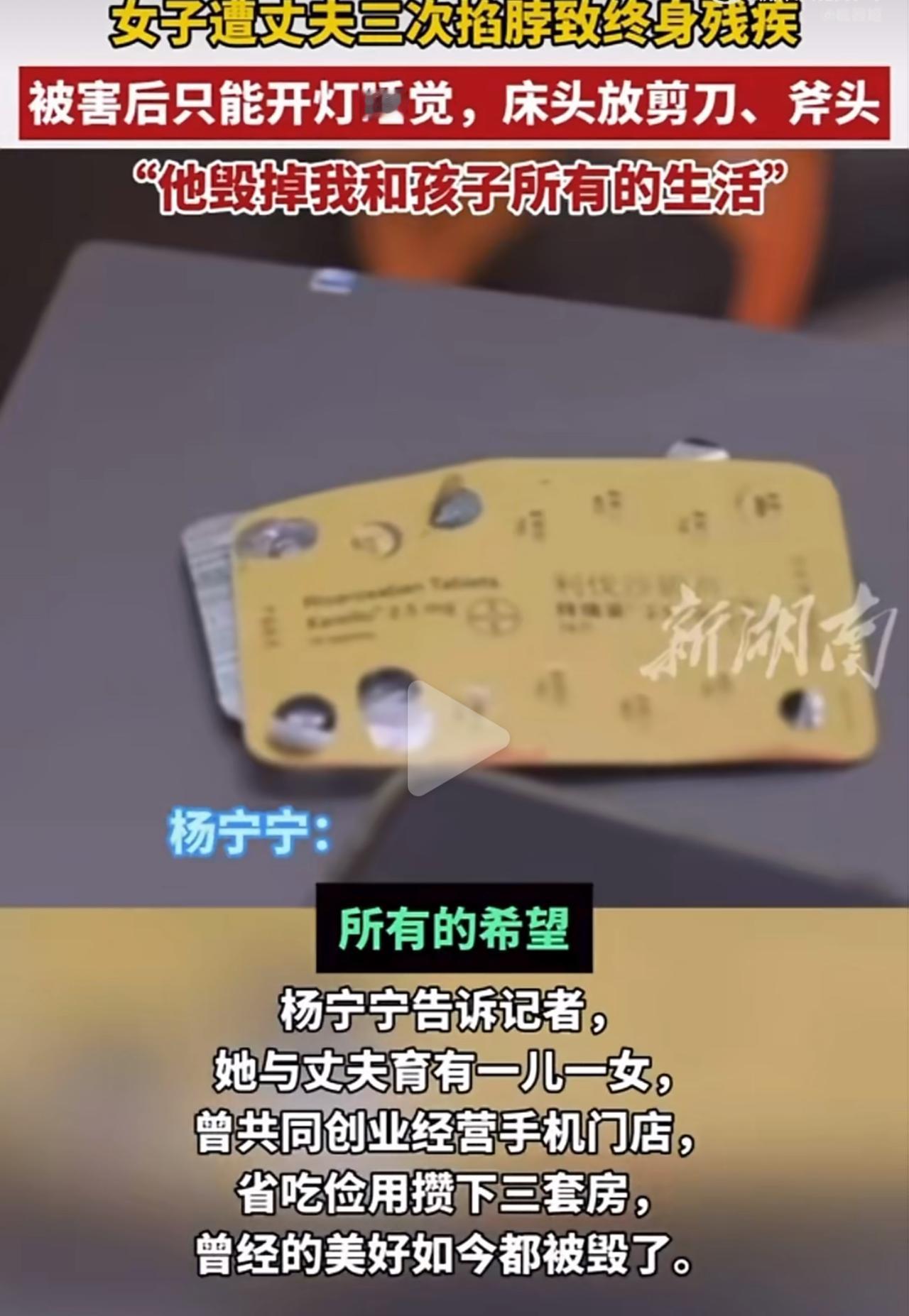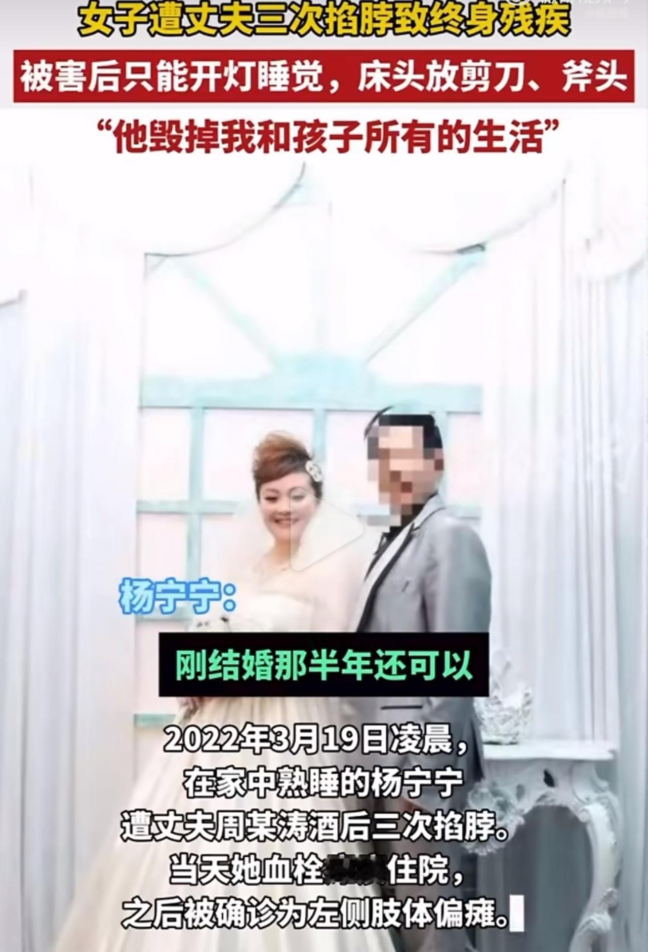 2022年那个凌晨,杨宁宁睡得正香,喝醉酒的丈夫周某涛突然扑过来,死死掐住她的脖子,掐了三次还不算,还把她的头狠狠往床头柜上撞!这13年的婚姻里,家暴就没断过,可这次最狠,直接把她右侧颈内动脉撞坏引发了脑梗,五级伤残彻底瘫在轮椅上。以前孕期被他打流产、儿子小时候还被他烟头烫伤的那些事儿,现在想起来,每一件都像刀子扎在心上! 2026年1月判决一出来,大伙都炸了——周某涛就判了6年!就因为他自己自首、送了趟医,就这么轻判了?他这十几年动不动就家暴的老底,居然压根没被当回事!杨宁宁的律师要求按故意杀人未遂来判,他动手那会儿,明明确确喊着要弄死她的!结果法院竟以他后来停手拿药为由,不认他有杀人的心思。更让人寒心的是,周某涛在法庭上半分悔意都没有,反倒倒打一耙,说是杨宁宁毁了这个家。 杨宁宁如今生活完全不能自理,一天顶多坐20分钟,孩子也受牵连,14岁儿子抑郁自残,女儿也有心理问题。家里三套房产被丈夫转移,她卖光资产治病还欠24万,只能靠借债和捐助过活,夜夜开灯睡觉,床头摆着剪刀斧头防身。 网友全怒了,同类案中受暴女子杀夫判11年,这边致妻子终身残疾才6年,量刑太失衡。杨宁宁当初以为家暴是家务事没及时报警,保护令也没拦住暴力,反家暴的短板全暴露了。她现在组建维权小组、直播筹医疗费,还申请抗诉,就为讨个公道。家暴 掐脖 脑梗