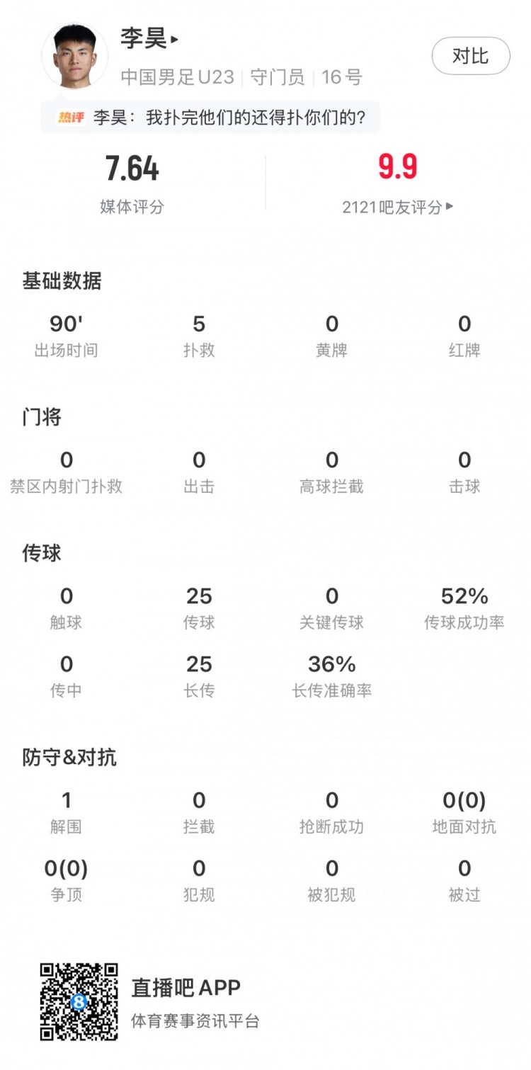 本场比赛李昊继续神勇表现,高接低挡力保国足球门不失,全场比赛他做出了5次扑救,获得了队内最高的7.64分评分。