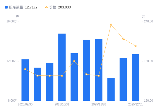 日期A股户数(户)流通A股户均持股数(股)户均持股市值(万元)2026-01-091364335686.69113.172025-12-311271386102.44123.902025-12-191232316295.92134.752025-12-101028317544.93177.582025-11-281423095451.8986.142025-11-201415305481.8987.752025-11-101280196060.45109.092025-10-311477595250.8082.972025-10-201184666549.16103.462025-10-101134506838.72108.19