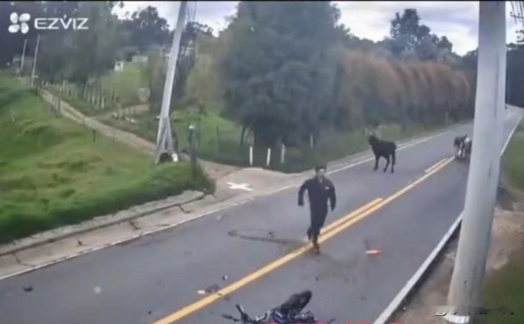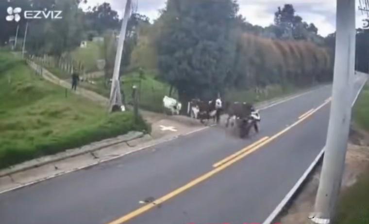 一人驾着摩托车,顺着大路行驶,一个丁字土路口冲出来几头牛,驾车人躲闪不及,车撞到了一头牛,牛和驾车人双双倒在了地上,那人从路的一边摔到了另一边,车毁了,人是不是亡了,还是一个未知数。牛虽然撞倒了,跌跌撞撞的又爬起来,与另外几头牛走了,看来也受伤的不轻吧。 后面的牛主人看到了,慌忙跑过来查看救助,打120把驾车人送到了医院。 牛太老实了,俗话说的好,老实人吃大亏,牛的结局注定是悲剧的。当时牛躺地上,你不起来我不起来,你找大夫,牛找兽医,结局注定完美。[捂脸] 路政40%责任,没明显路牌和路面划线提示,牛主人55%责任,驾驶人5%。路政交管部门有责任,没有路口减速交通标志,也没有路面划线提示,路口树木影响观察路口情况;摩托车驾驶人有责任,他通过路口,没有做的减速观察通行;牛主人有责任,他没有控制牛安全通过路口。无论谁的责任轻重,驾驶人根据路况、控制车速是交通安全的关键要素。