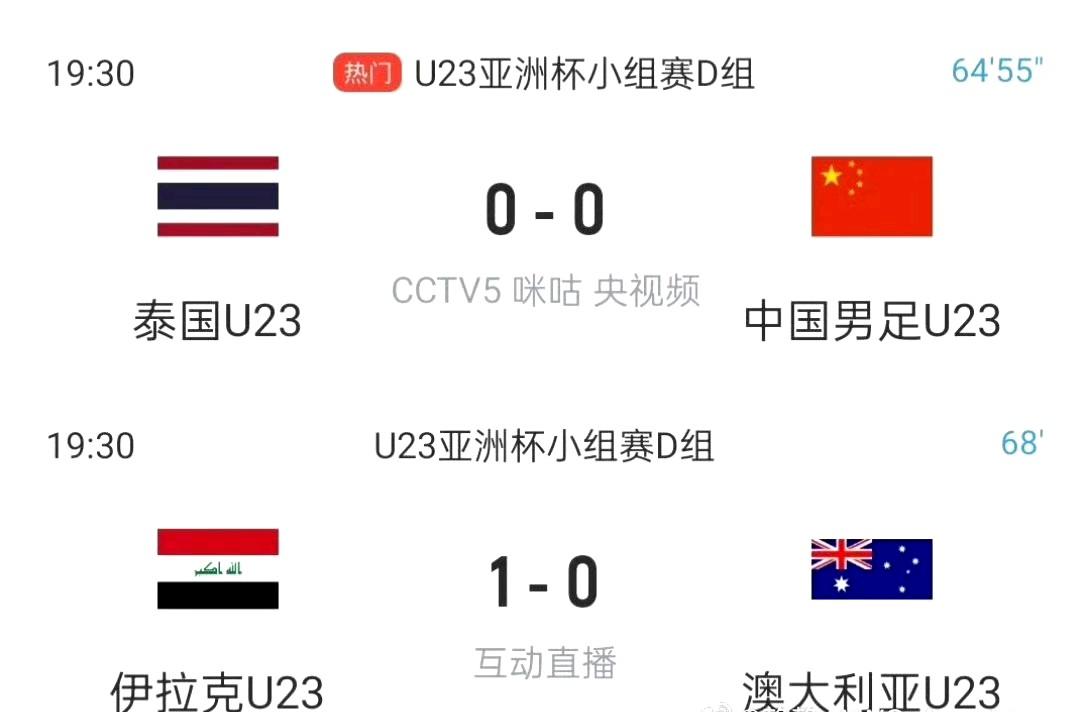 U23亚洲杯D组末轮实时比分,伊拉克1-0澳大利亚、国足0-0泰国。 按照目前比