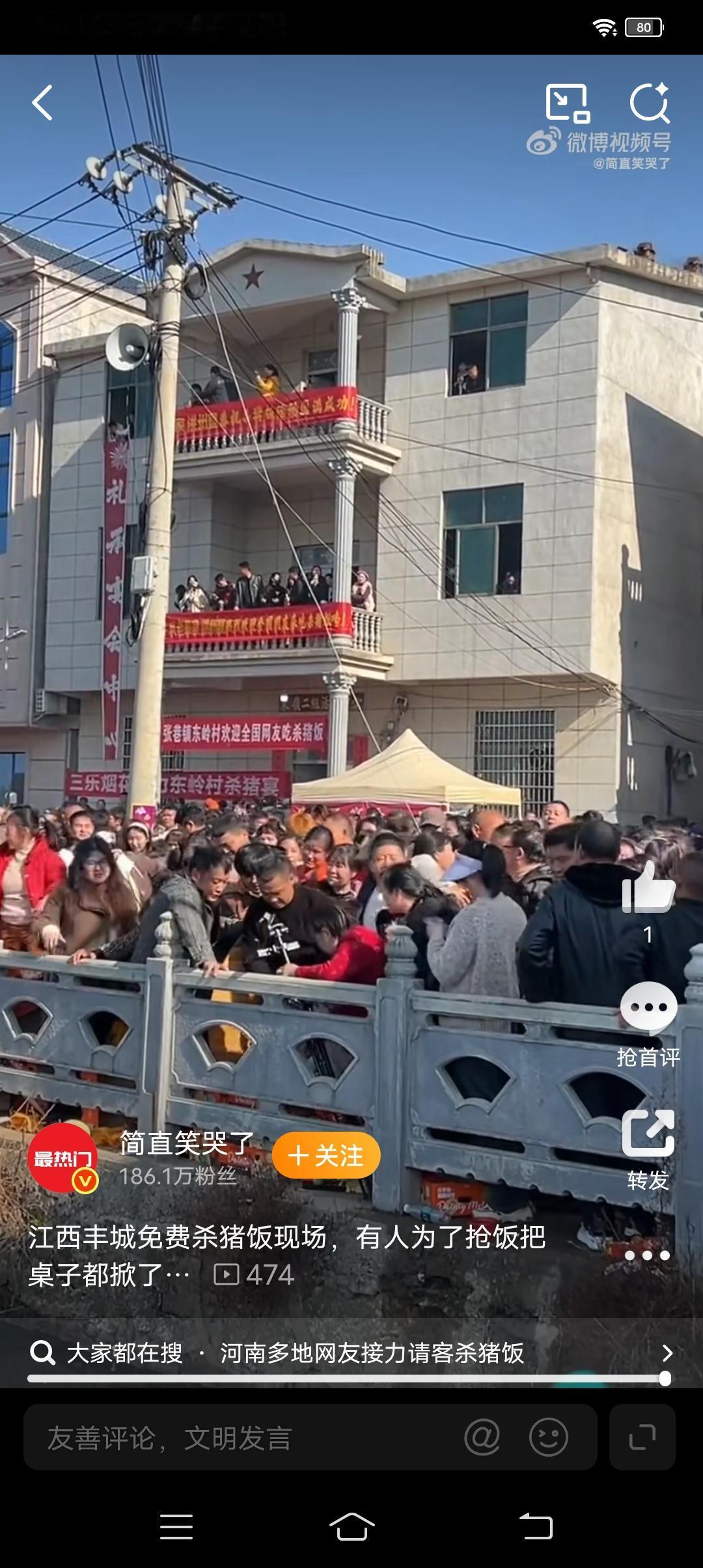 江西丰城“杀猪饭”场面失控,没素质的人直接抢饭,有人直接把桌子都掀了…… 评论区网友猜测: 应该都是附近村拖家带口来蹭饭的,外地网友应该不会这么没素质! 有网友甚至建议各地“杀猪饭”赶紧停止,免费的东西都是引来更多占便宜的人!这次江西丰城真的是丢脸丢大了! 这样看来,重庆合川“呆呆妹”举办了两三天就停止是多么的明智。